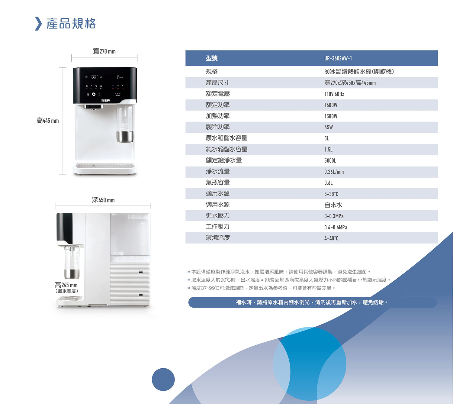 【賀眾牌】輕盈氣泡飲水機 瞬熱飲水機 UR-3602AW-1 (免安裝氣泡冰溫熱雙UV殺菌RO)