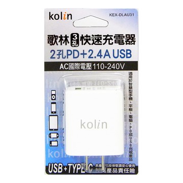 Kolin 歌林 3.1A三孔USB+PD快速充電器 KEX-DLAU33