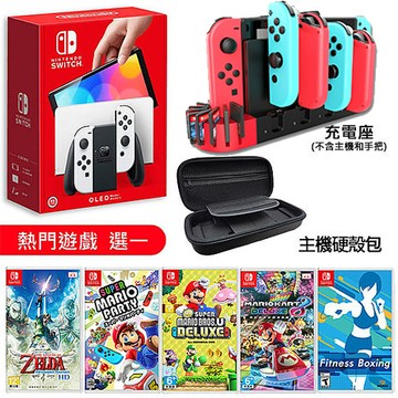 點我下載任天堂 Switch OLED白色主機(台灣公司貨)+遊戲選一+Joy-Con充電座+主機收納包+玻