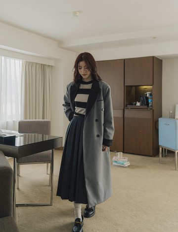 葉狀翻領-寬鬆長版風衣外套-米白色