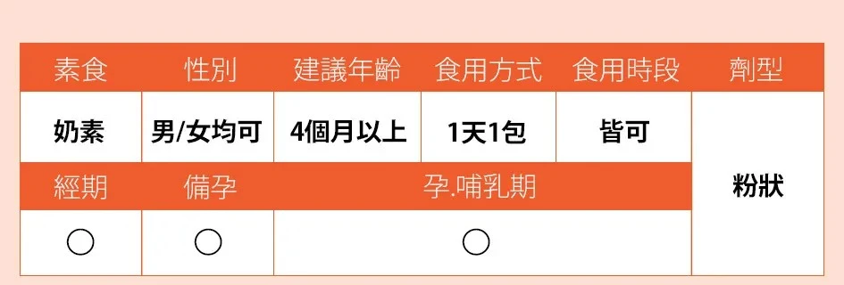 本產品4個月以上(有在吃副食品)的嬰幼兒、兒童青少年、成人、銀髮族,孕媽咪或哺乳期皆可食用。此為奶素配方,素食者可食用。