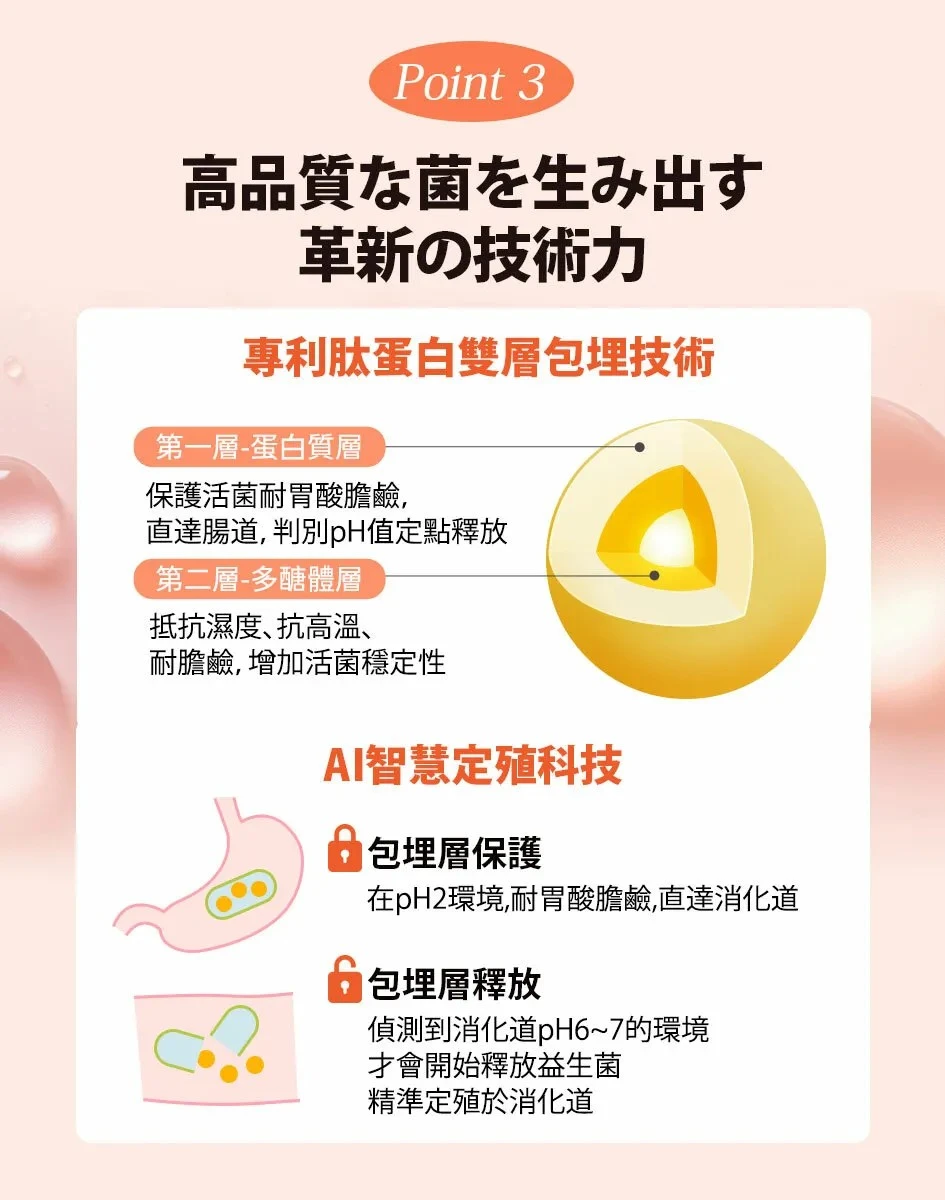 透過專利肽蛋白雙層包埋技術,能耐胃酸膽鹼,同時抵禦辣椒、蔥、薑、蒜等辛香食材,適合亞洲飲食習慣,吃美食也不擔心益生菌被破壞,讓保健效果更有感。
