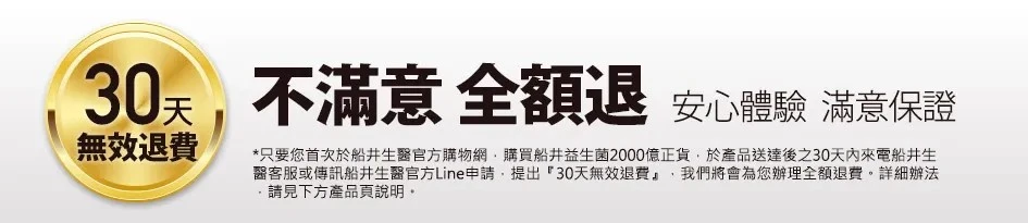 凡首次於船井生醫官方購物網,購買【船井益生菌2000億正貨】,若於收貨後30天內對產品不滿意,可透過「客服專線」或「船井生醫官方LINE」提出申請,我們將提供無須理由的全額退費服務。(限船井生醫官網訂單)