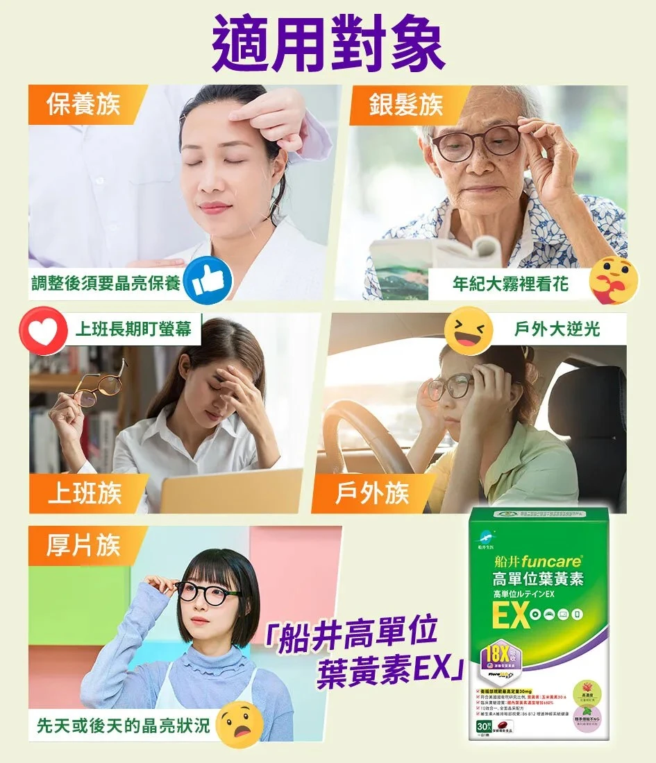 高單位葉黃素EX在配方成分、功效都有升級,特別針對高度用眼工作者、長期使用3C族、以及輕熟齡、銀髮族等容易流失葉黃素且有高度視力保健需求者而設計。