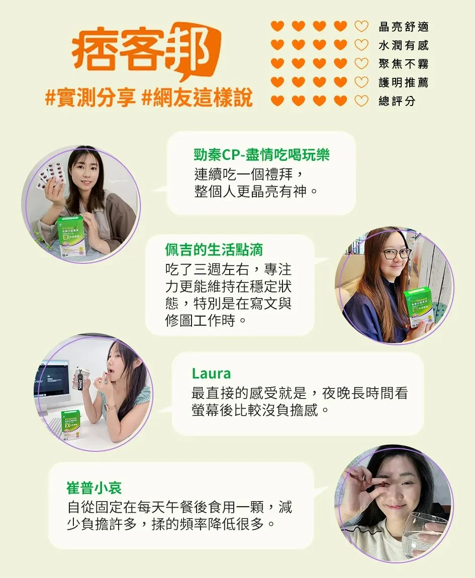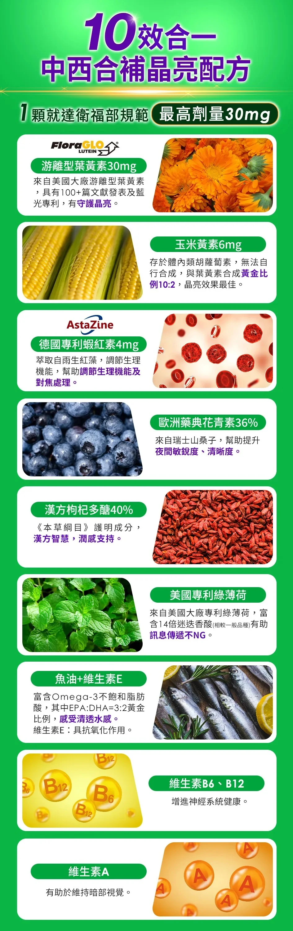 例如:魚油 Omega-3 能增加葉黃素吸收率,同時提升潤澤感;枸杞自古以來即是晶亮保健成分,幫助舒緩不適;針對高度用眼、輕熟齡族,特別添加蝦紅素與綠薄荷(含有迷迭香酸),加強調節力與晶亮傳輸力。