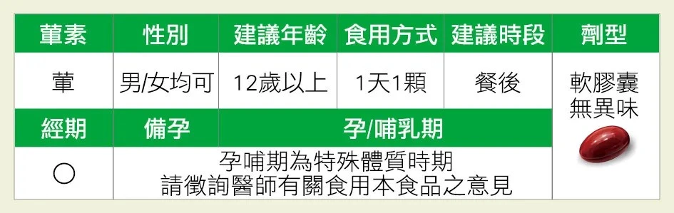 12歲以上,1天1顆。孕婦、12歲以下孩童及特殊病症者,請依照醫生指示食用。