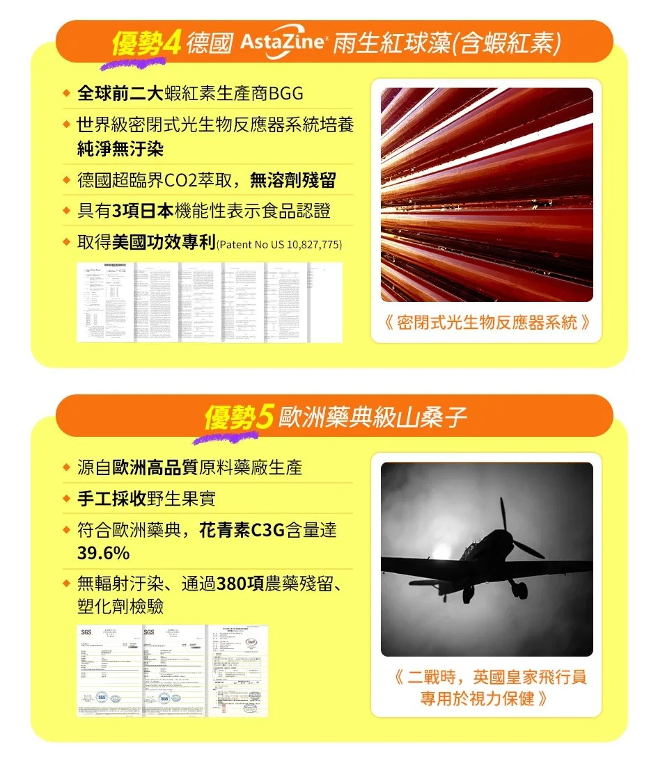 成分含有蝦紅素,海鮮過敏者可以吃嗎?船井高單位葉黃素EX使用的專利蝦紅素,是來自德國雨生紅藻萃取而成,並非蝦子來源,海鮮過敏者亦可安心食用。