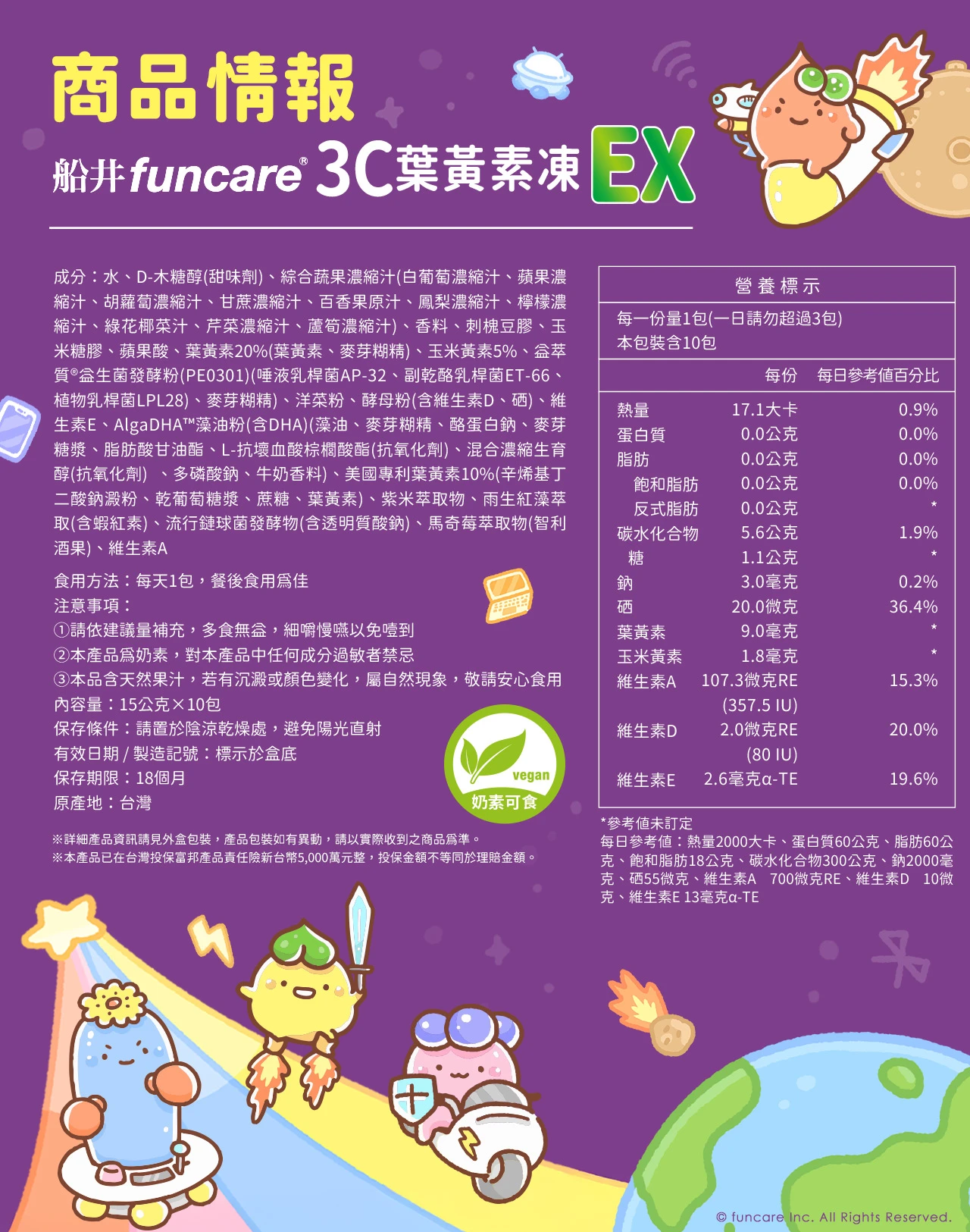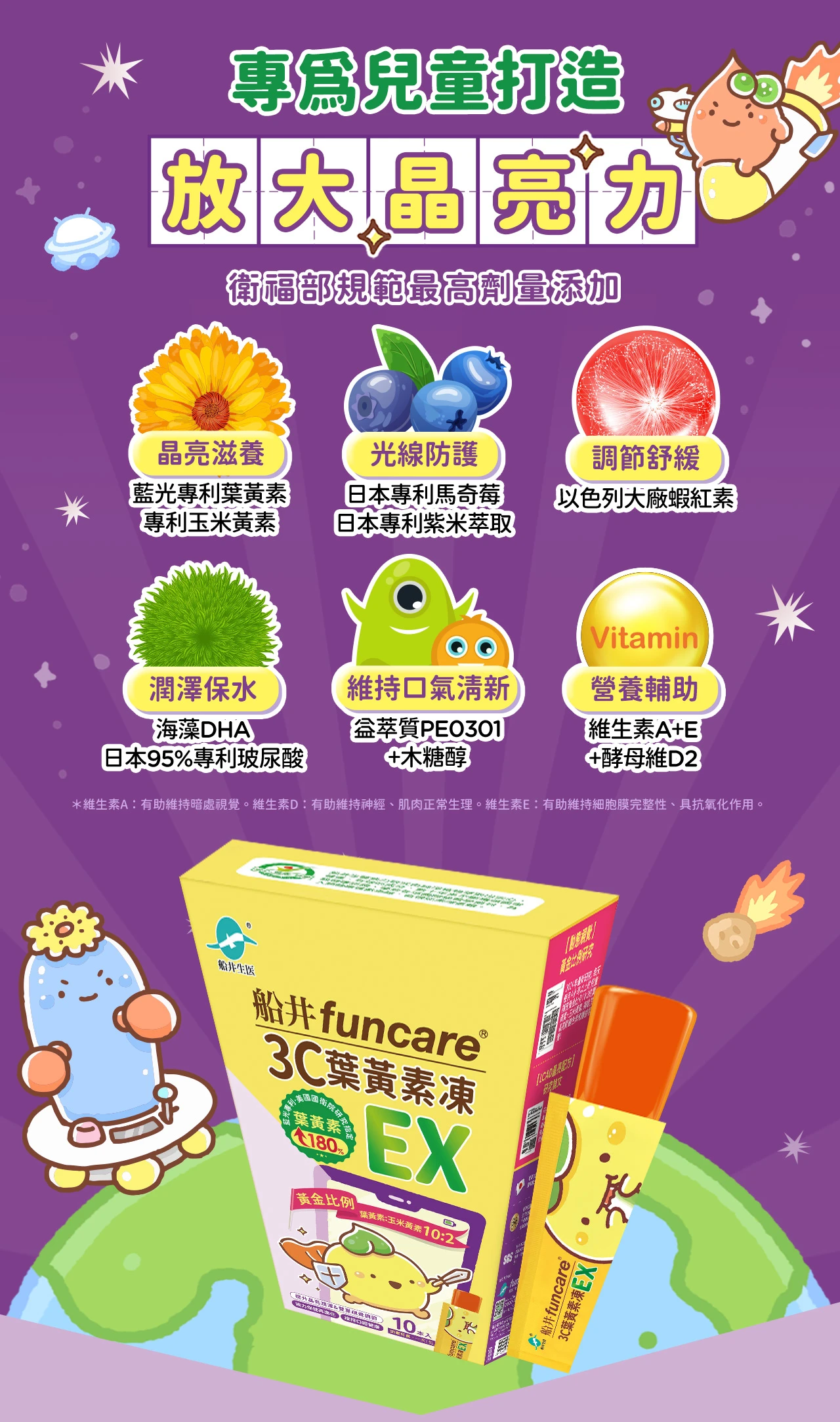 可以搭配船井兒童DHA純淨魚油、船井牛奶鈣魚膠原粉、船井益生菌口嚼錠、船井陽光維生素D3滴劑食用,補足成長所需營養、全方位照護。