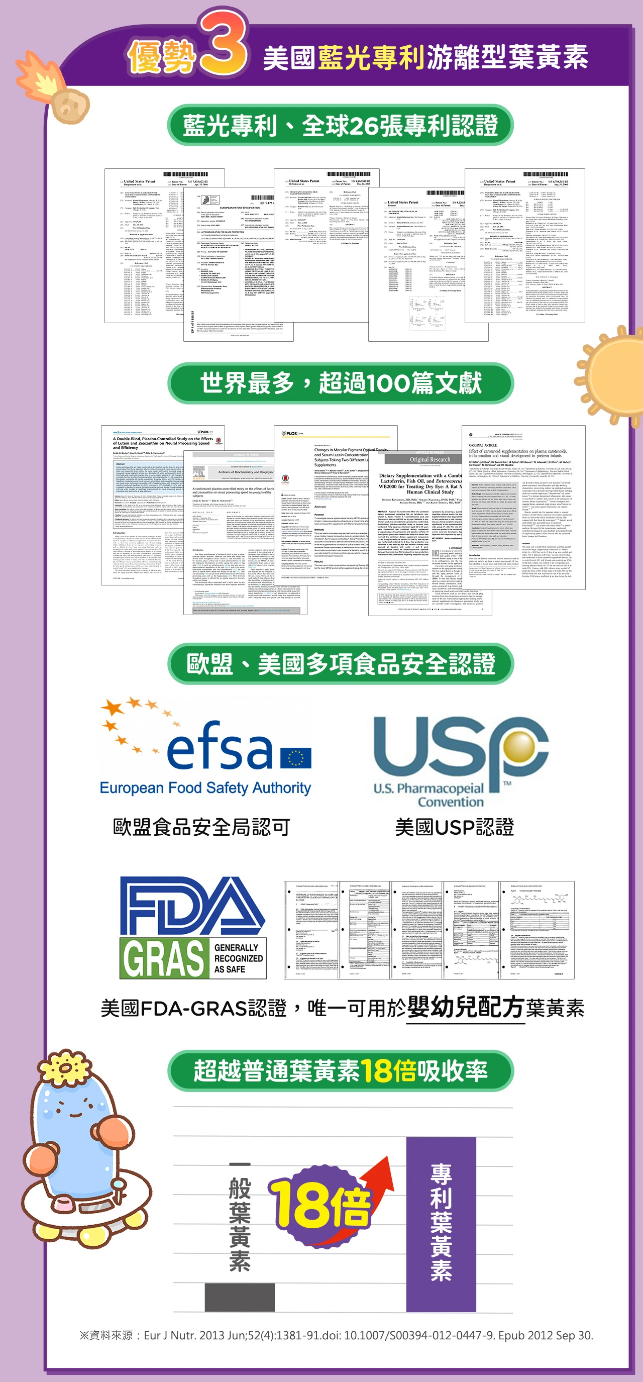 3C葉黃素凍EX使用的葉黃素和玉米黃素皆是專利成分,同時符合衛福部規範最高劑量及黃金比例=葉黃素9mg:玉米黃素1.2mg,新添加以色列蝦紅素、日本專利高濃度玻尿酸及海藻DHA共同保護孩子晶亮