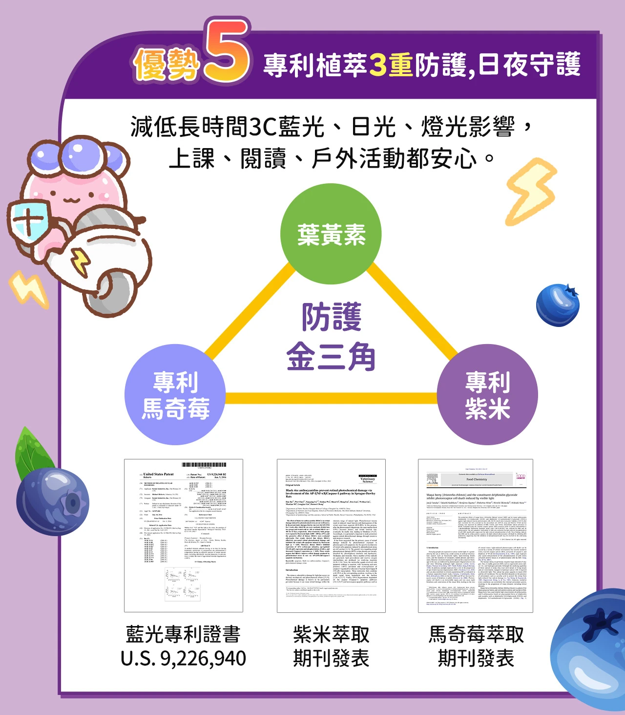 日本專利紫米、馬奇莓(智利酒果)中含有高濃度花青素,複合葉黃素有助於光防護、全面守護孩子晶亮。