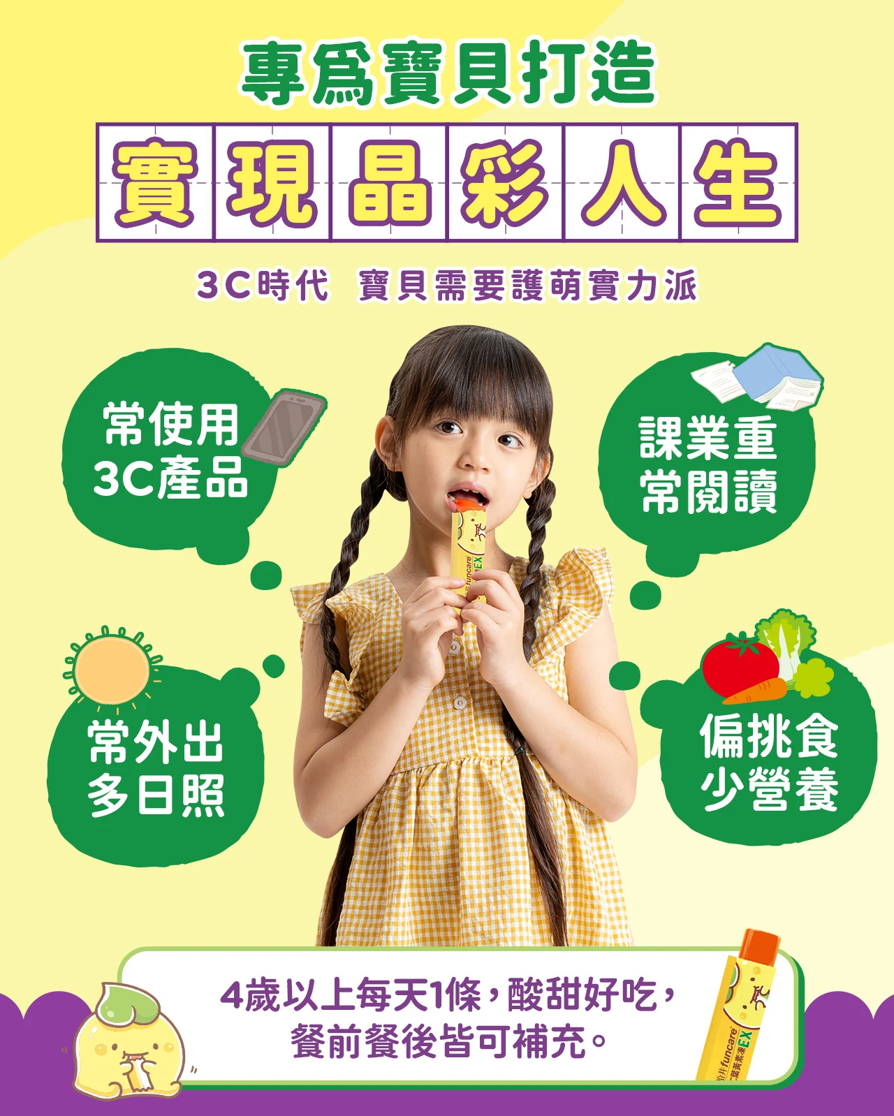 4歲起的幼童開始接觸到各種光線的刺激,落實減少傷害,適當補充葉黃素,奠定晶亮好基礎,每天一包,為寶貝守護好適野。
