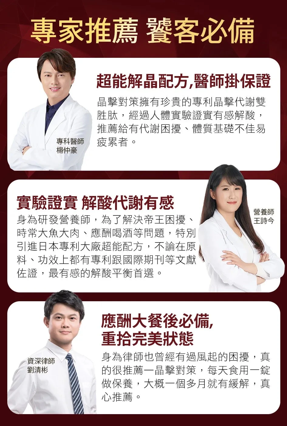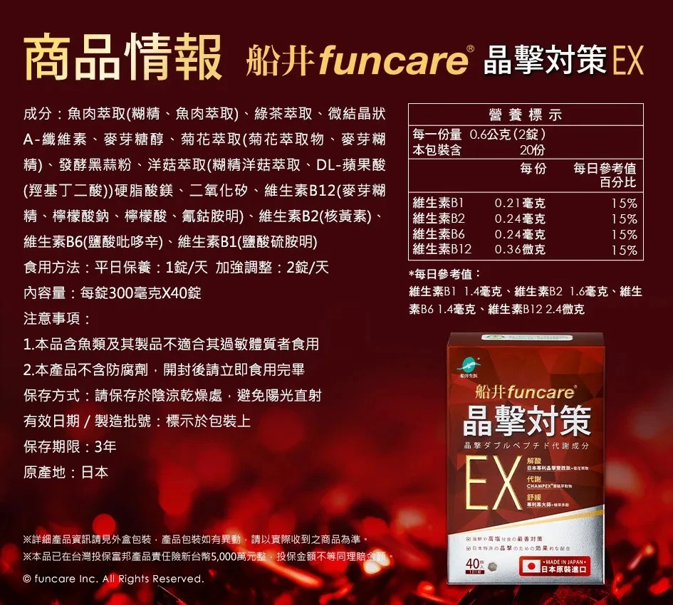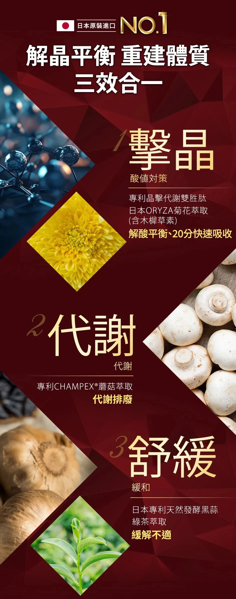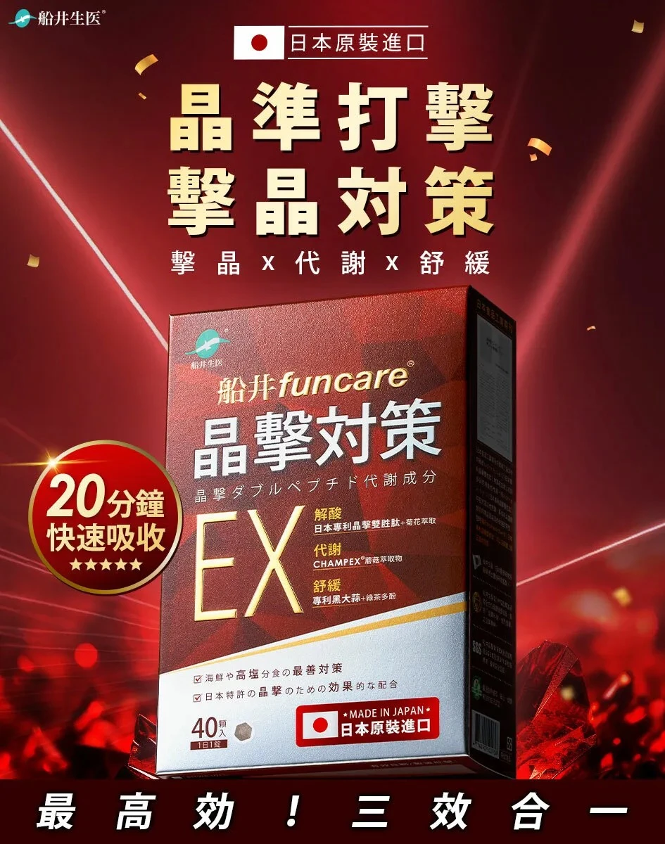 船井晶擊對策EX,為日本原裝進口,嚴選日本機能性功能認證成分專利晶擊代謝雙胜肽,搭配日本ORYZA菊花萃取 (含木樨草素),有助於解酸平衡,並搭配專利CHAMPEX®蘑菇萃取,加乘代謝排廢力,日本專利天然發酵黑蒜、綠茶萃取,舒緩不適,為深受皇帝困擾的族群,提供緩解對策。