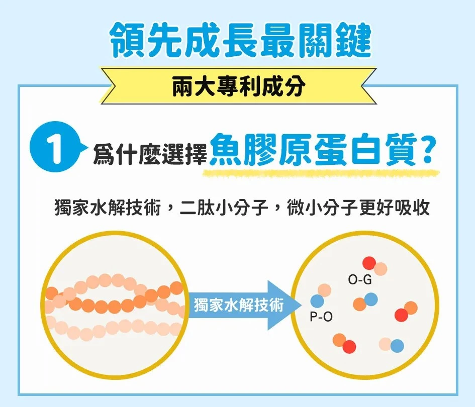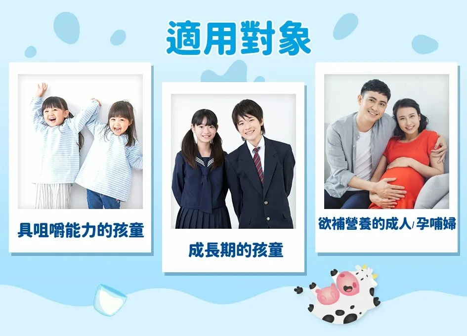3歲以上具咀嚼能力者,成長發育中的孩童,體內已經具備滿滿的生長能量與因子,只要能夠補充足夠並且好吸收的營養素-鈣質及魚膠原蛋白質,滿足孩子的需求,便能使孩子進入正常的成長階段。