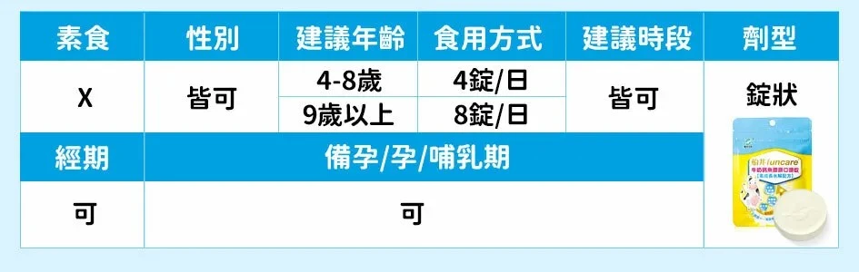 | 建議吃法 | 4-8歲 1天1包 9歲以上 1天2包(早晚各1包) | 3-8歲 1天4顆 9歲以上 1天最多8顆 | 4-8歲 一天1包 9歲以上 一天2包(早晚各1包) |