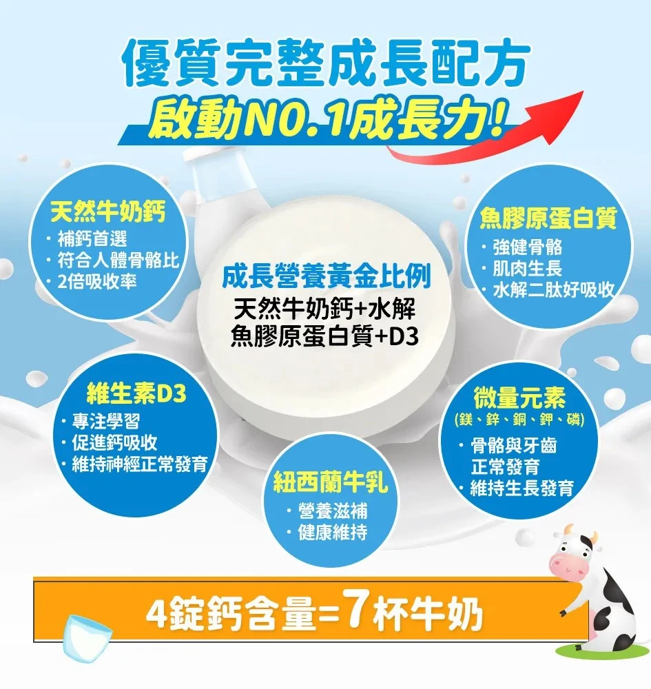 Q 牛奶鈣魚膠原口嚼錠跟其他高成長產品有什麼不同?