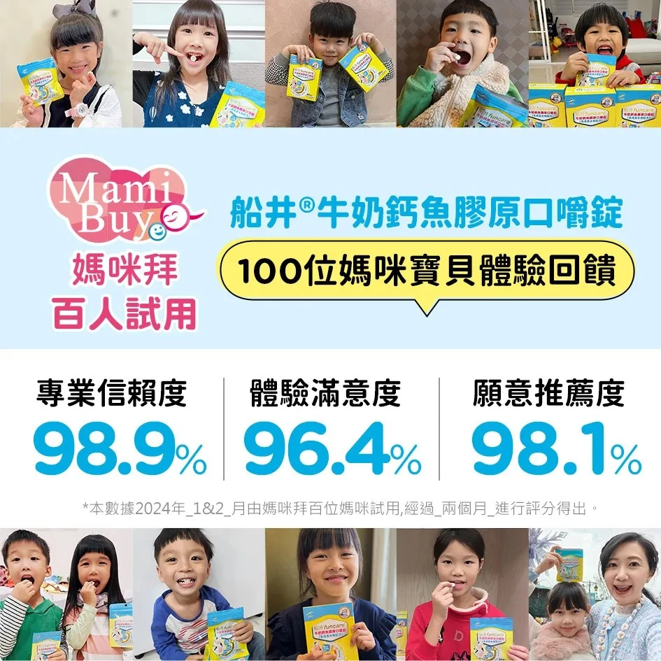 船井牛奶鈣魚膠原口嚼錠,不添加香料、色素、防腐劑,通過854項食安檢驗,符合最高規格安全標準,站在第一線為您的健康把關。