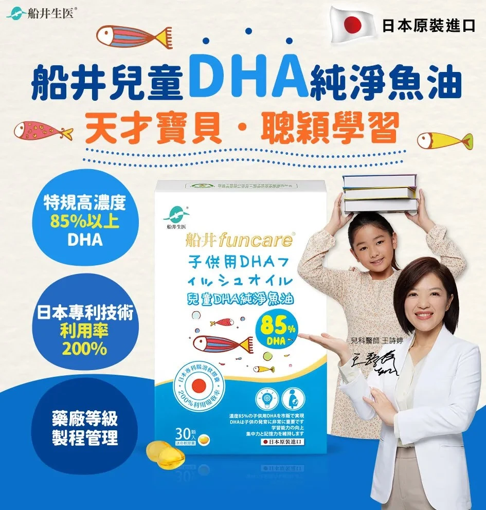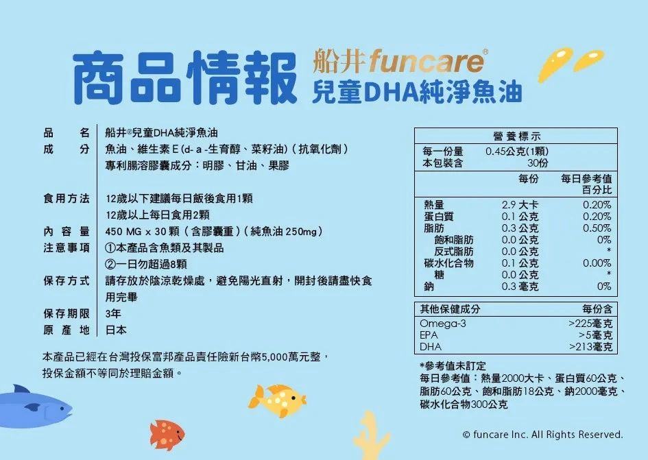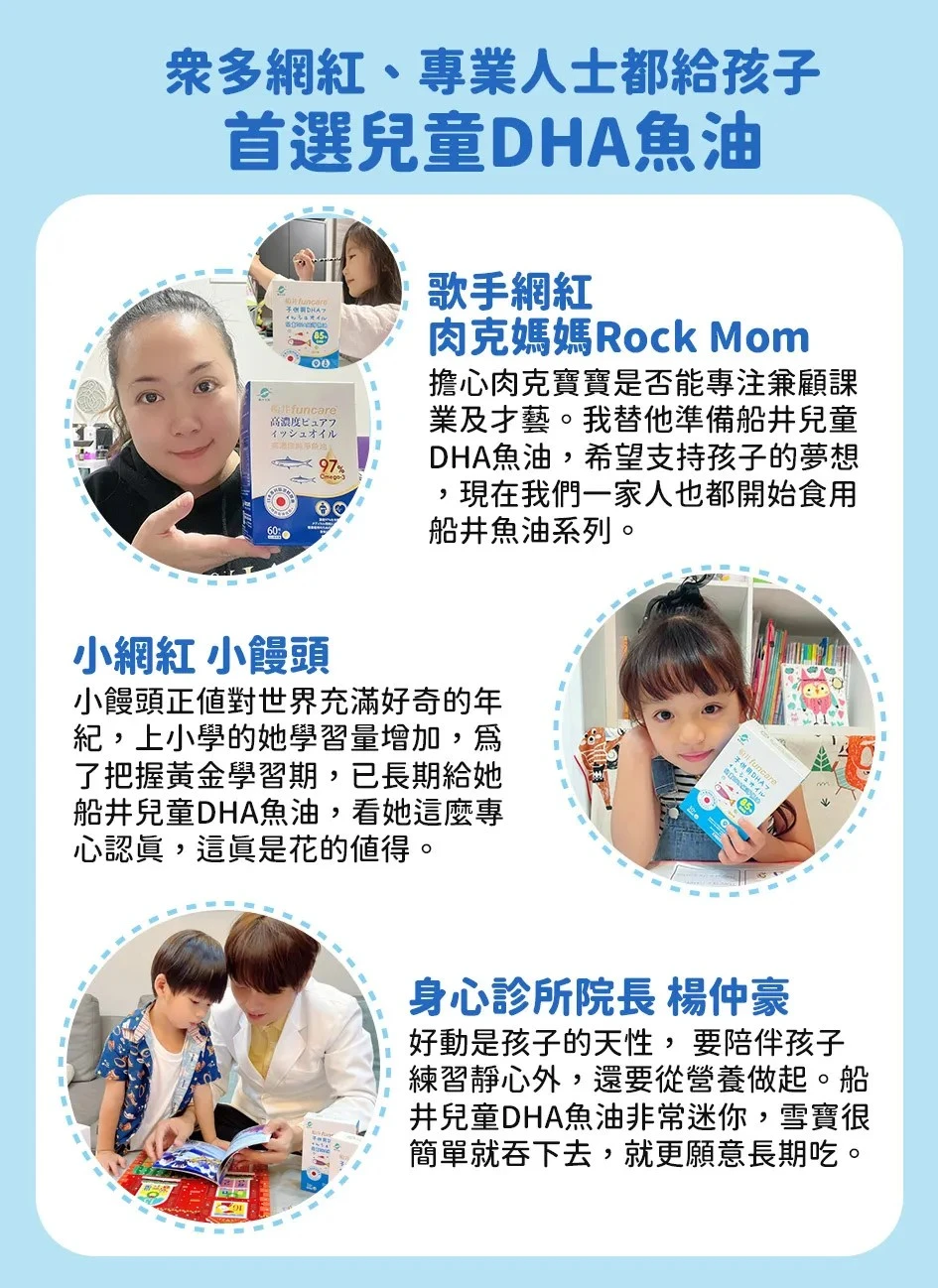 建議兒童可以一天一顆『船井兒童DHA純淨魚油』,孕媽咪則可以一天兩顆,加強補充。