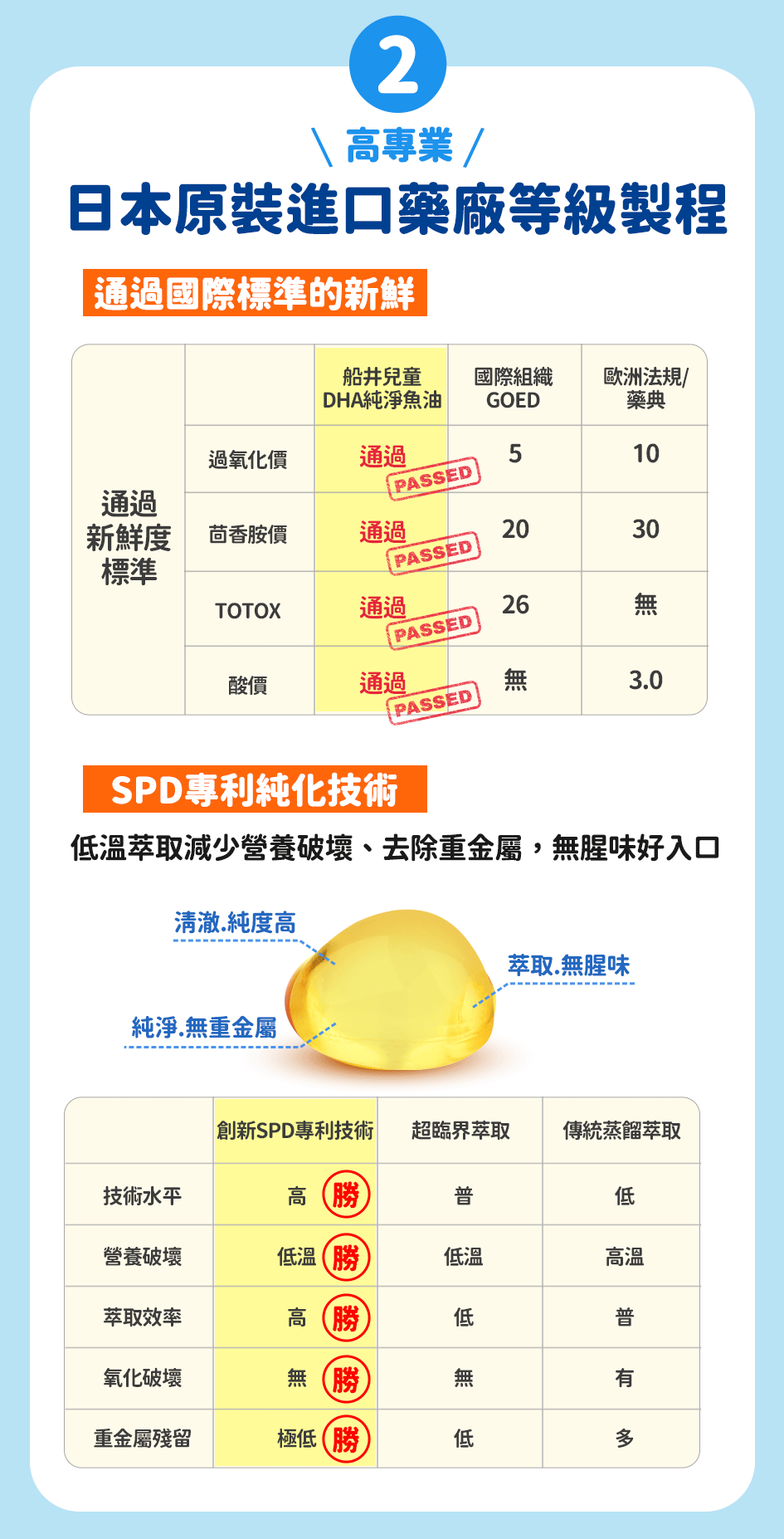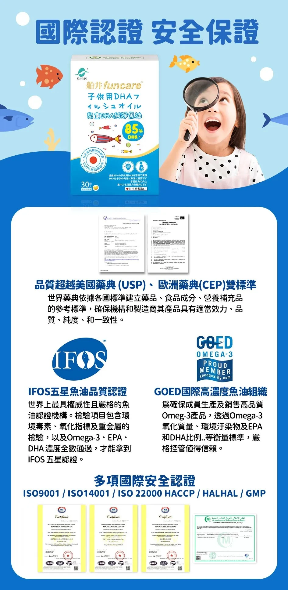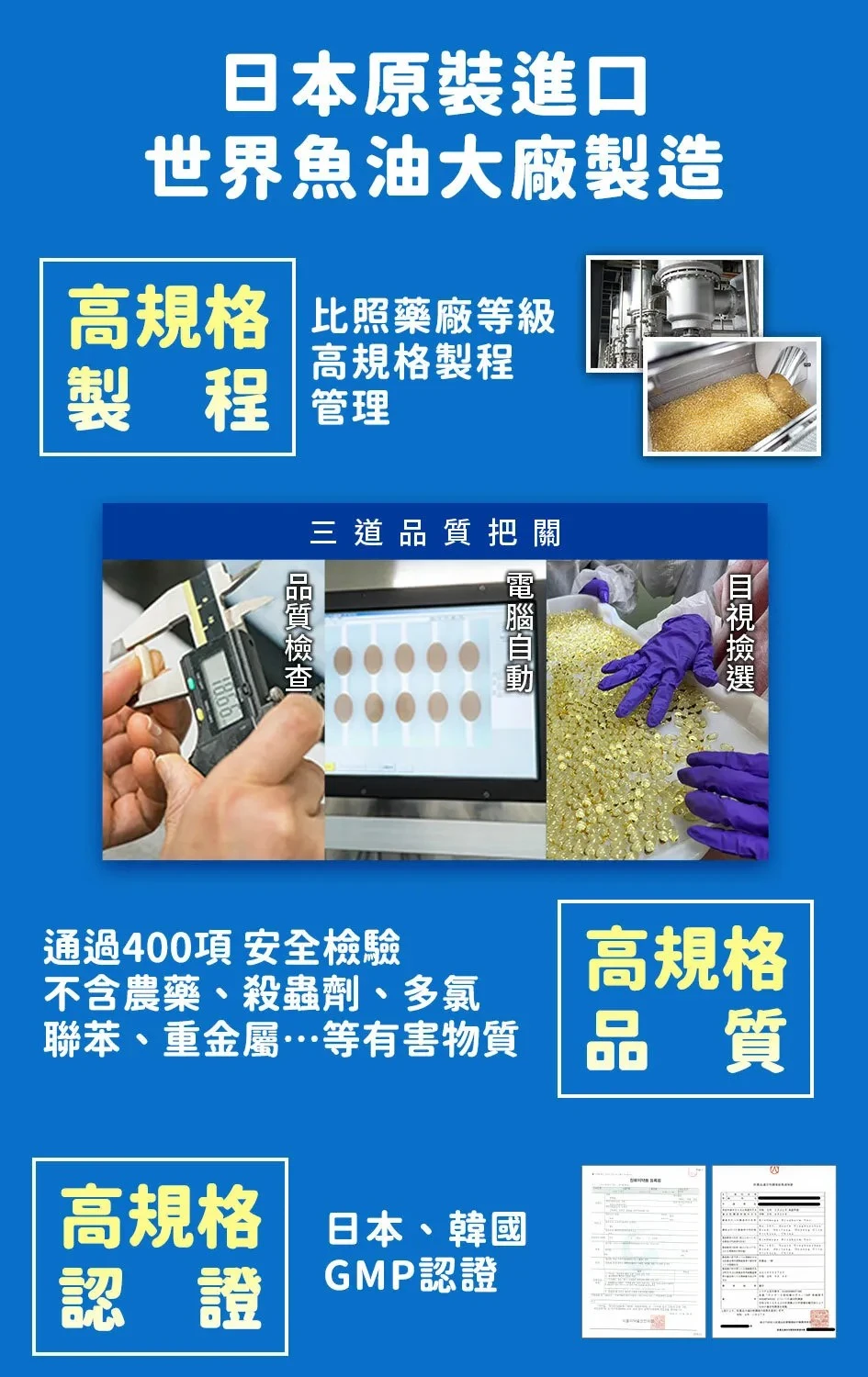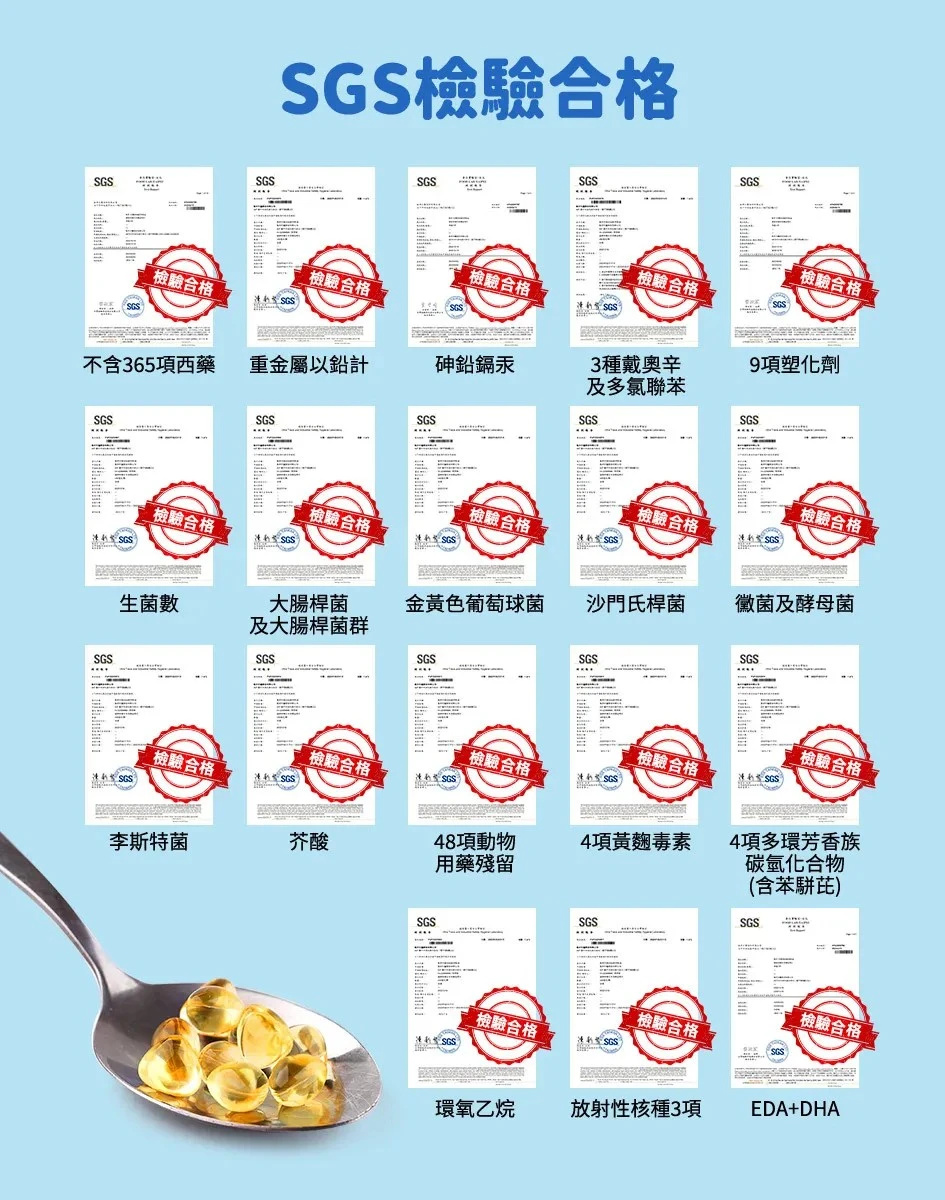 2. 有國際檢驗:魚油最擔心的是新鮮度及重金屬,須注意產品是否附上新鮮度檢驗報告(過氧化值、總氧化值、茴香胺值)及汙染檢驗報告(重金屬、塑化劑、輻射..等),並且確認魚種為小型海洋魚類,減少食物鏈汙染累績,確保魚油品質。