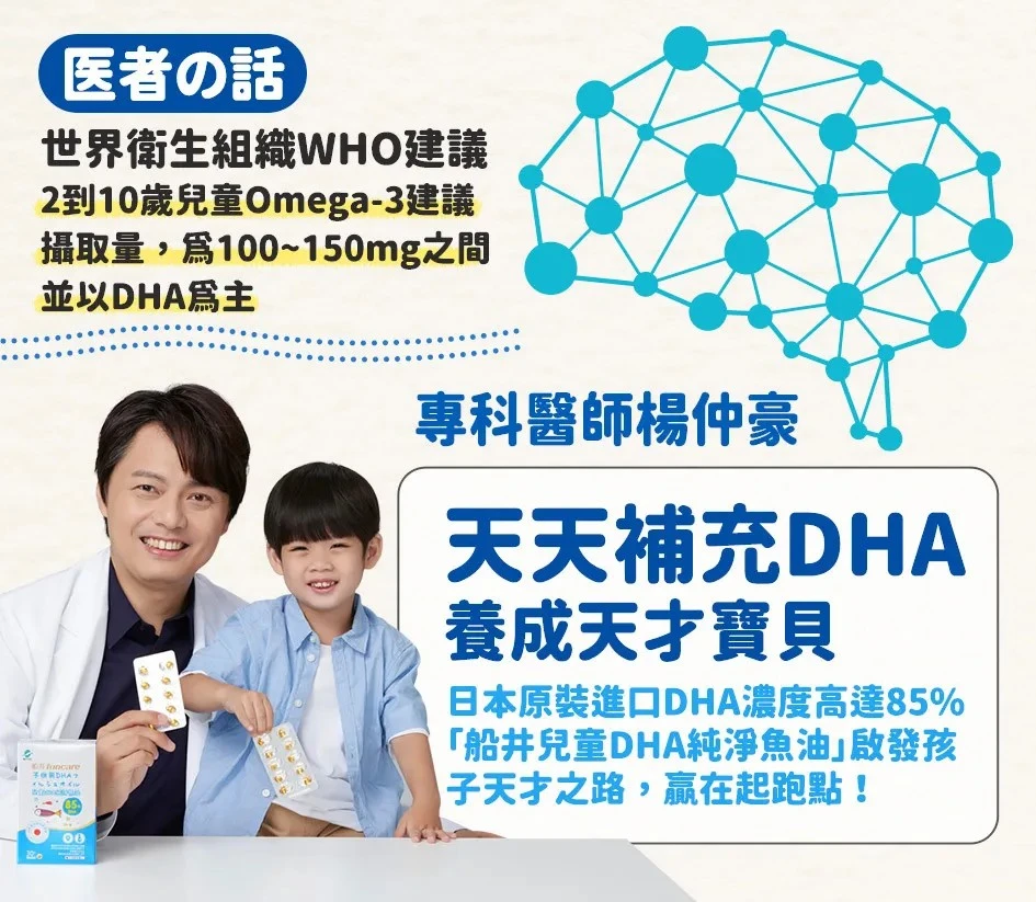 ●2到10歲兒童:WHO世界衛生組織建議,一天攝取的omega-3魚油的建議量為100~250mg之間,更建議以DHA為主要來源。