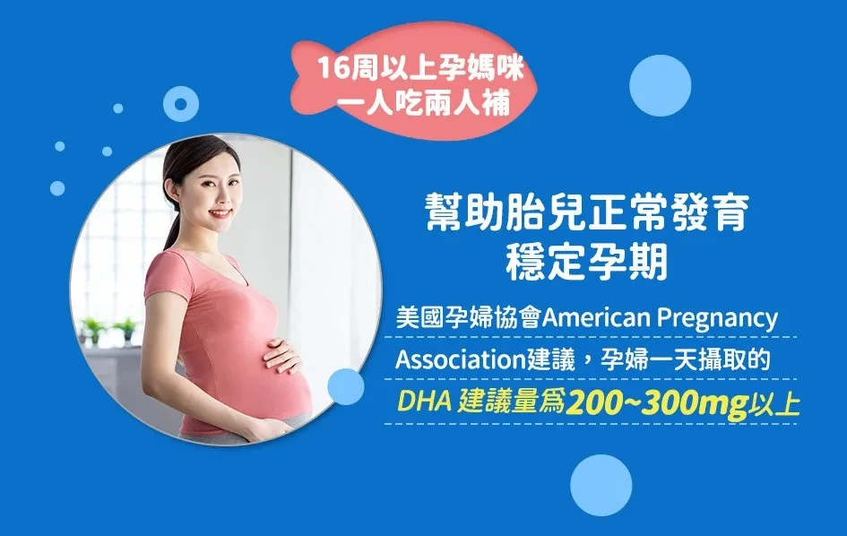 ●16周以上孕婦:美國孕婦協會American Pregnancy Association建議,一天攝取的DHA 建議量為200~300mg以上。