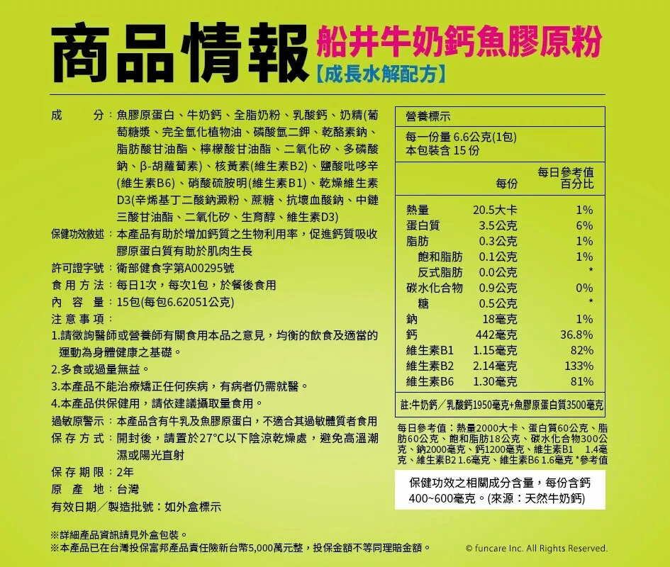 成份有添加香料、色素等添加物嗎?船井牛奶鈣魚膠原粉通過衛福部核准「健康食品」,不添加香料、色素、防腐劑,符合最高規格安全標準,家長可以放心放孩子長期補充。