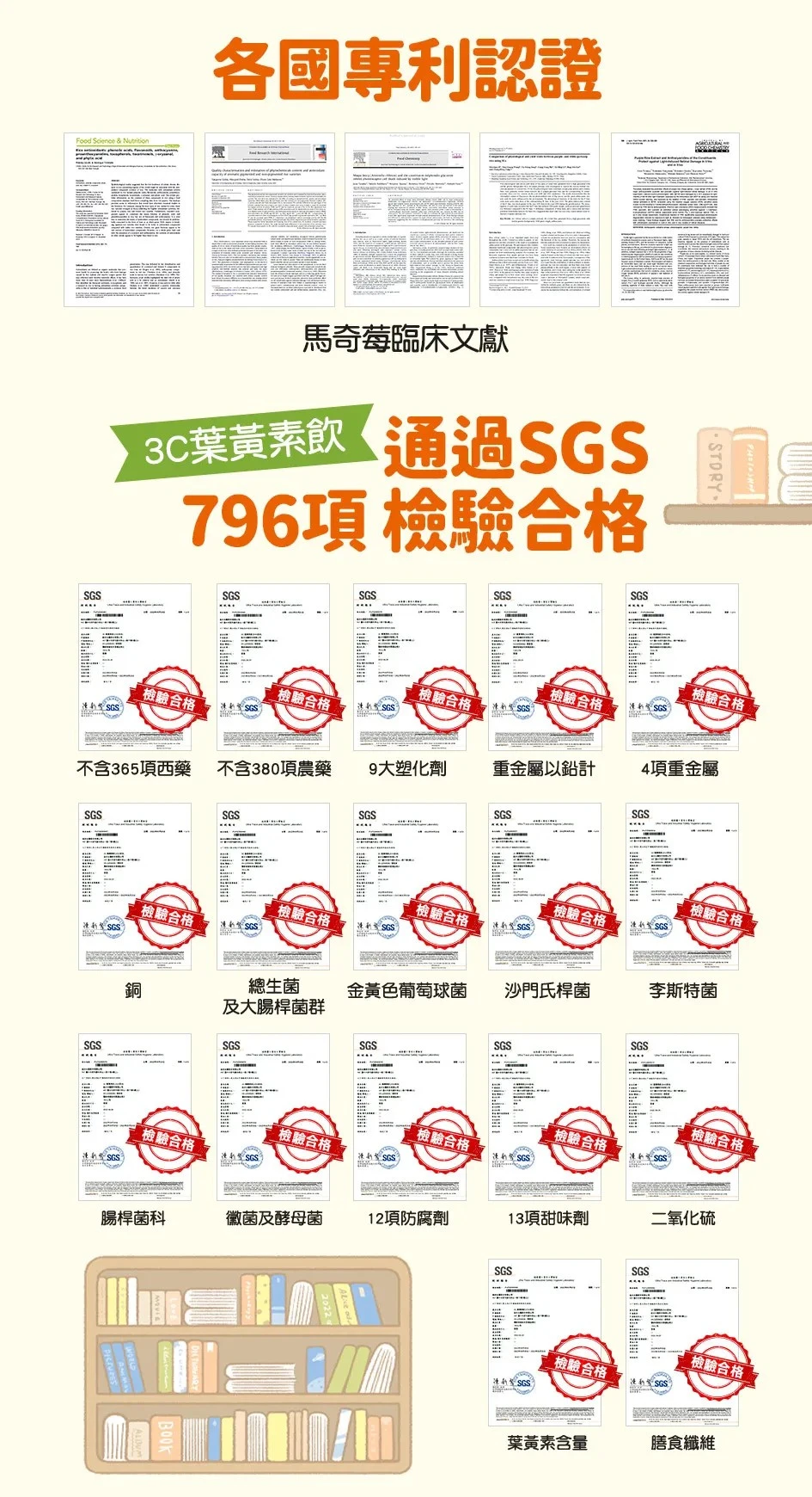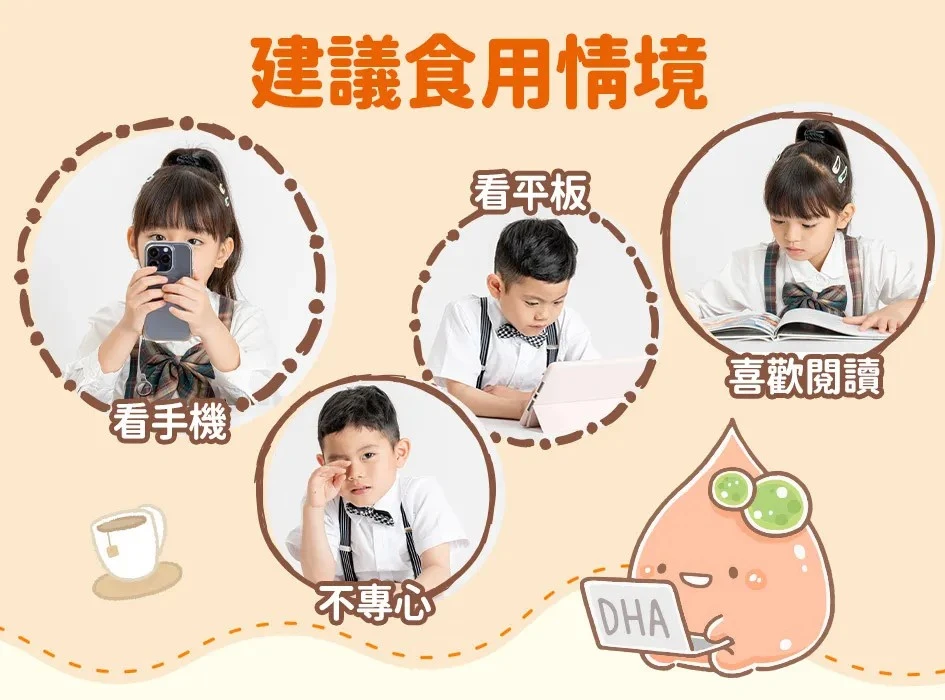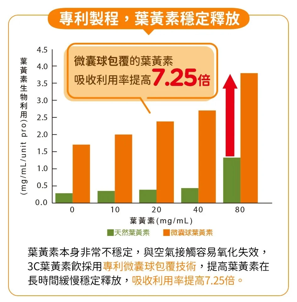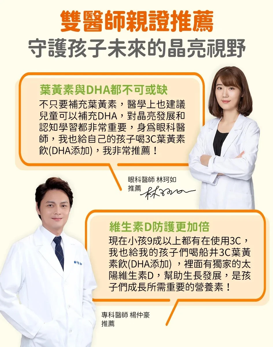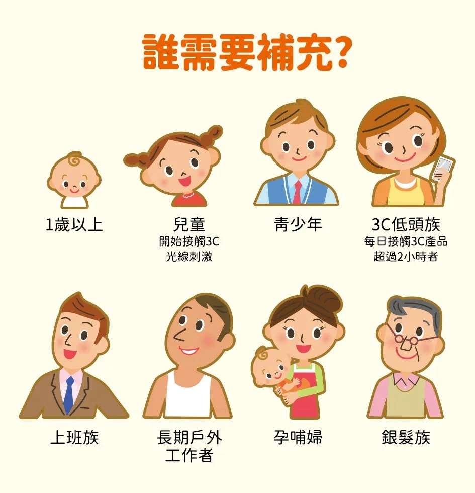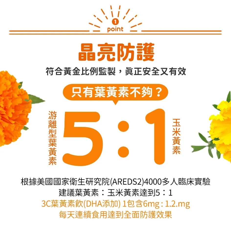 A.歐洲食品安全局建議12歲以下的兒童每日需補充6毫克葉黃素以達一日所需,故一天一包3C葉黃素飲(DHA添加),加上飲食中自然存在的葉黃素,即可達到一日所需,若是使用3C時間較長,則一天兩包,早餐及午餐後各一包即可。