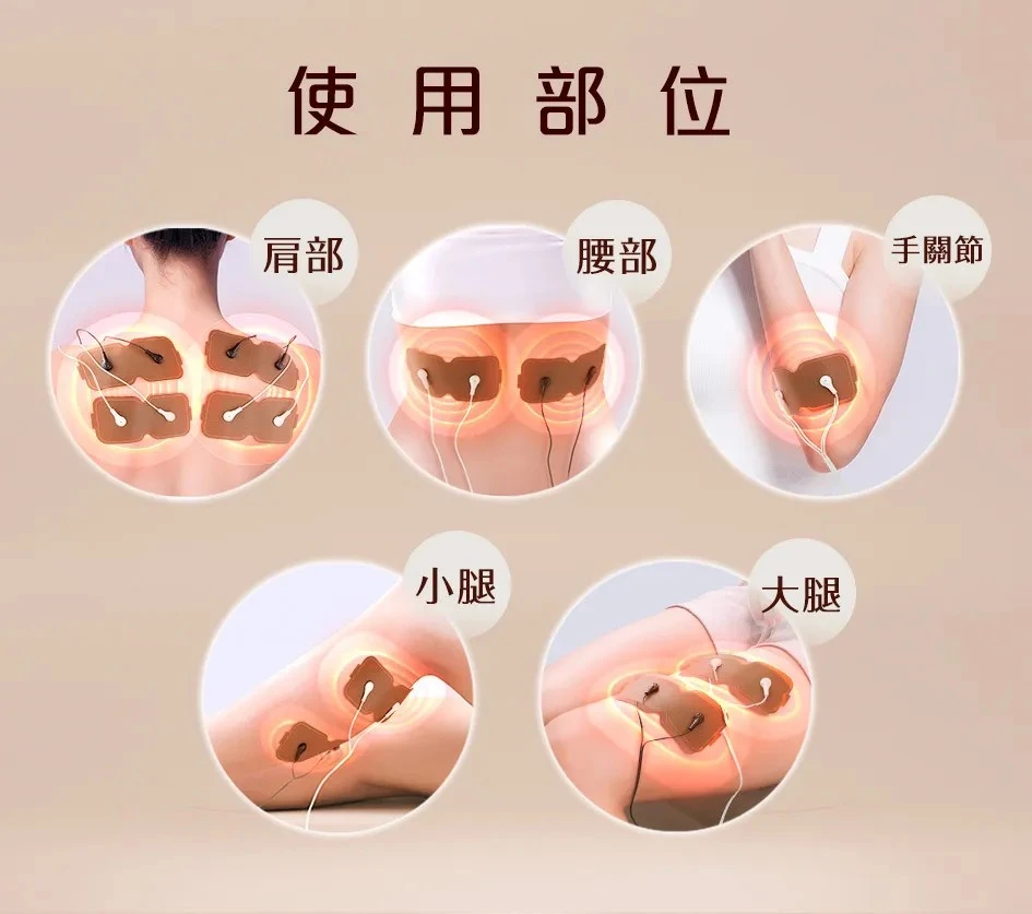 Q:可以貼在哪些部位?A:使用部位可在肩膀、腰、大腿、小腿、手關節等部位,不可將傳導片貼於心臟、頭、口、頸動脈、傷口、陰部及喉部或咽喉等敏感部位附近。