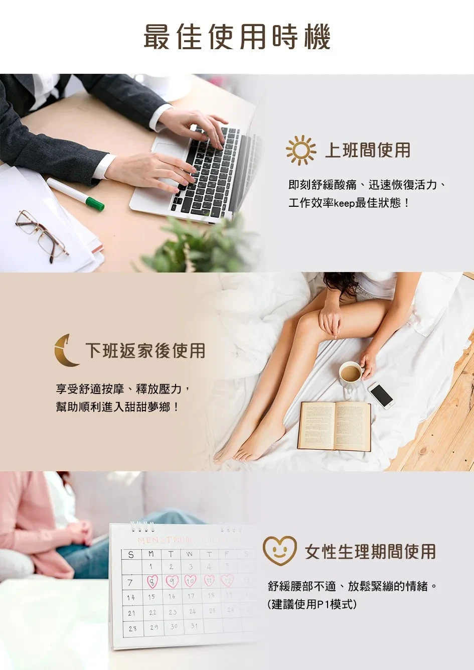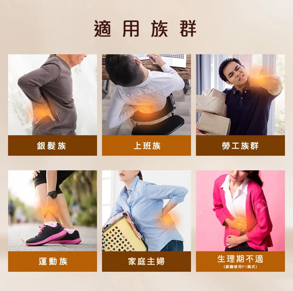 Q:酸痛按摩機適合哪些人使用?A:適合上班族、勞工族群、銀髮族、運動族和家庭主婦等,針對女性生理期不適,也可用於腰部放鬆緊繃。