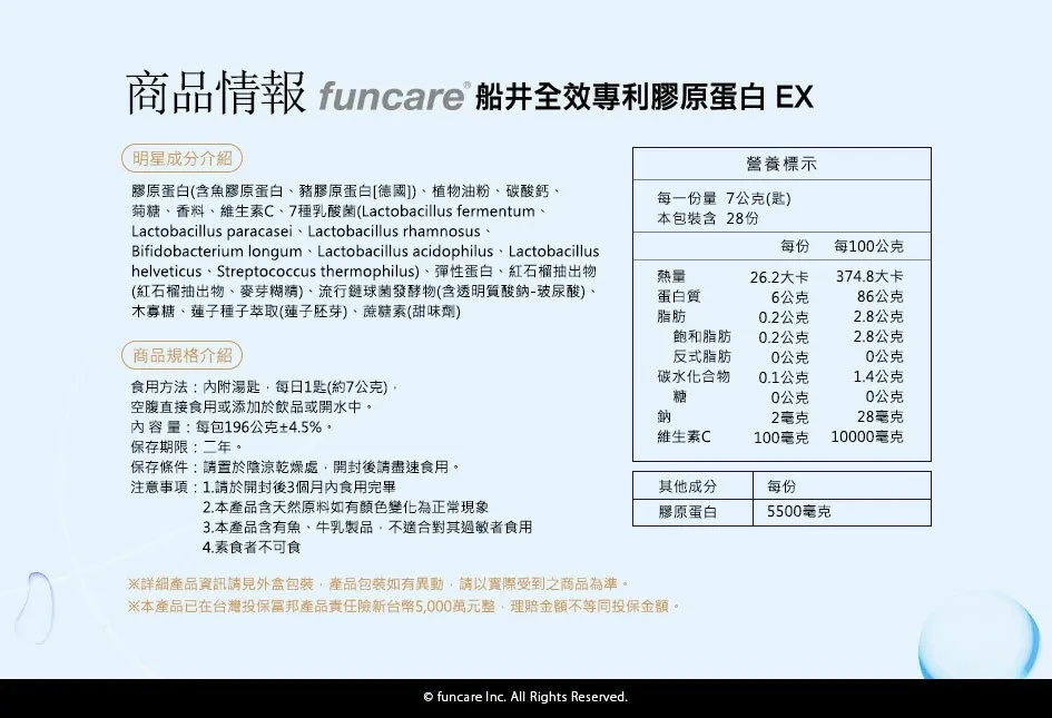 因為隨著年紀增長,膠原蛋白會流失,但是如果光靠食補,可能沒有辦法確實補充膠原蛋白。船井生醫添加「打破膠原蛋白無效論」的日本專利成份,並且針對亞洲人的需求添加美容成份,讓您快速有感。船井研發團隊實驗研究只要食用一匙為一天攝取量。空腹效果更佳,建議持續性的補充,讓美麗持續不中斷。