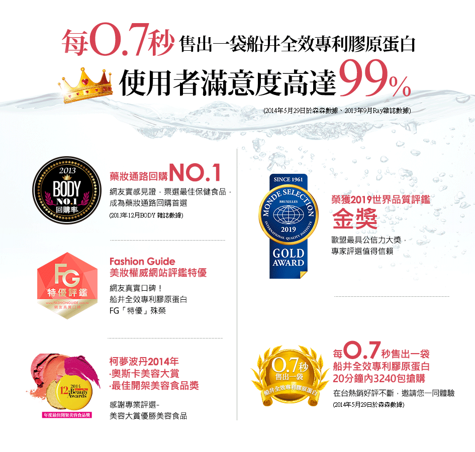 膠原蛋白分子量為30-50萬,船井膠原經過專利製程二段水解至小分子,單一胜肽分子量為180道爾頓,選擇胜肽級的膠原才能快速1-2小時通過吸收通道,輕鬆補給、快速有感。