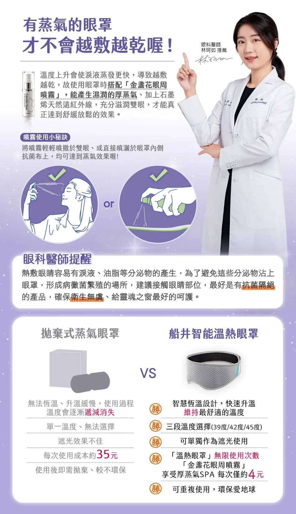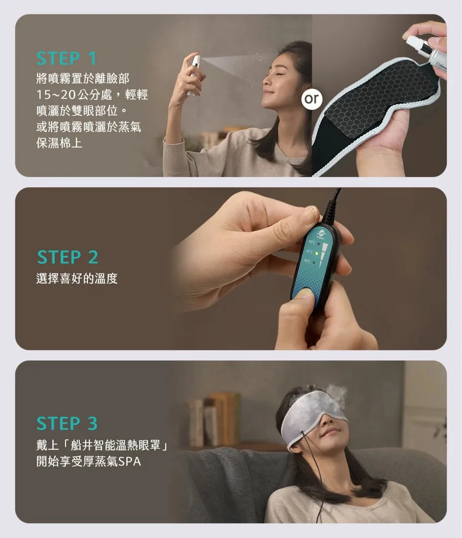 A. 「船井金盞花眼周噴霧」專為眼部設計,成分溫和不刺激!除了眼周保養功能,搭配溫熱眼罩還能達到蒸氣熱敷的效果。一般自來水含有氯、容易產生刺激感,其它噴霧因不確定是否適用於眼部,故均不建議搭配使用。