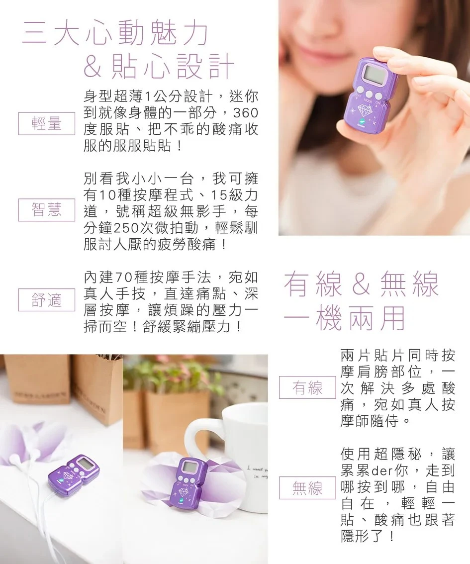 上班的一天中,不管多忙都能隨時隨地享受貼身按摩,輕鬆舒緩。內建10種按摩程式、15級力道、70種按摩技法,透過電極貼片溫柔包覆,宛如大師級手感膚觸,創造出多變,媲美SPA館的舒感按摩情境。隱形超薄,隱密度高,使用場所不受限,隨時隨地享受肩膀捶打按摩,放鬆緊繃肌肉、舒緩疲勞壓力、幫忙改善頸部僵硬、肩膀沈重等問題。