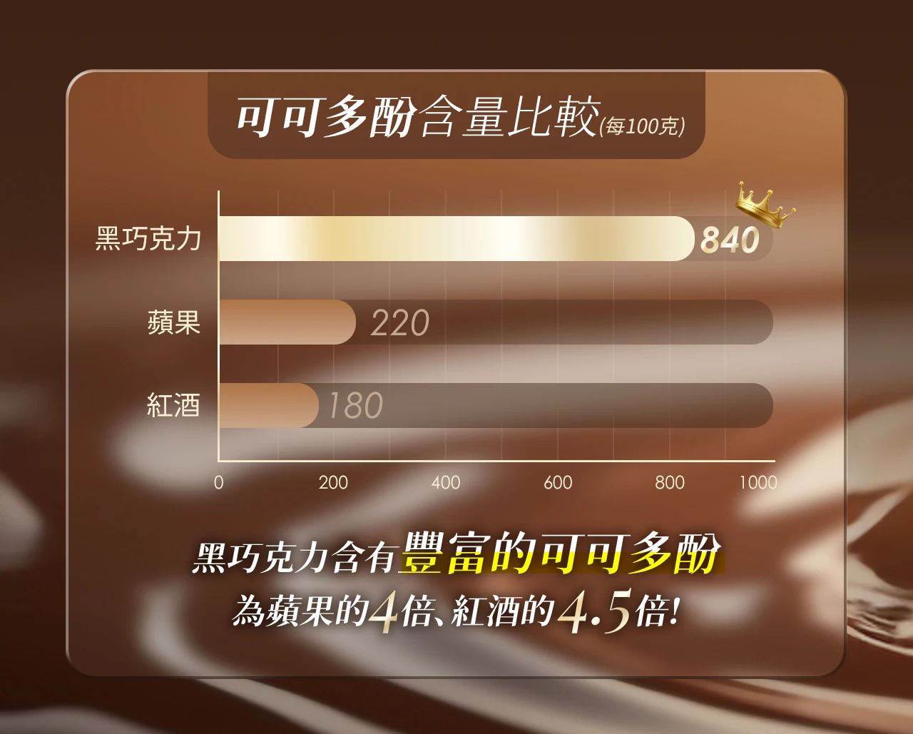 Q.機能黑巧克力可以每天吃嗎?吃多了會不會有副作用?可以!根據研究,高純度的黑巧克力含有豐富的可可多酚,為蘋果的4倍、紅酒的4.5倍!我們的機能巧克力經過專業檢驗,無添加西藥與重金屬,通過798項檢驗合格,不只美味更要安心。