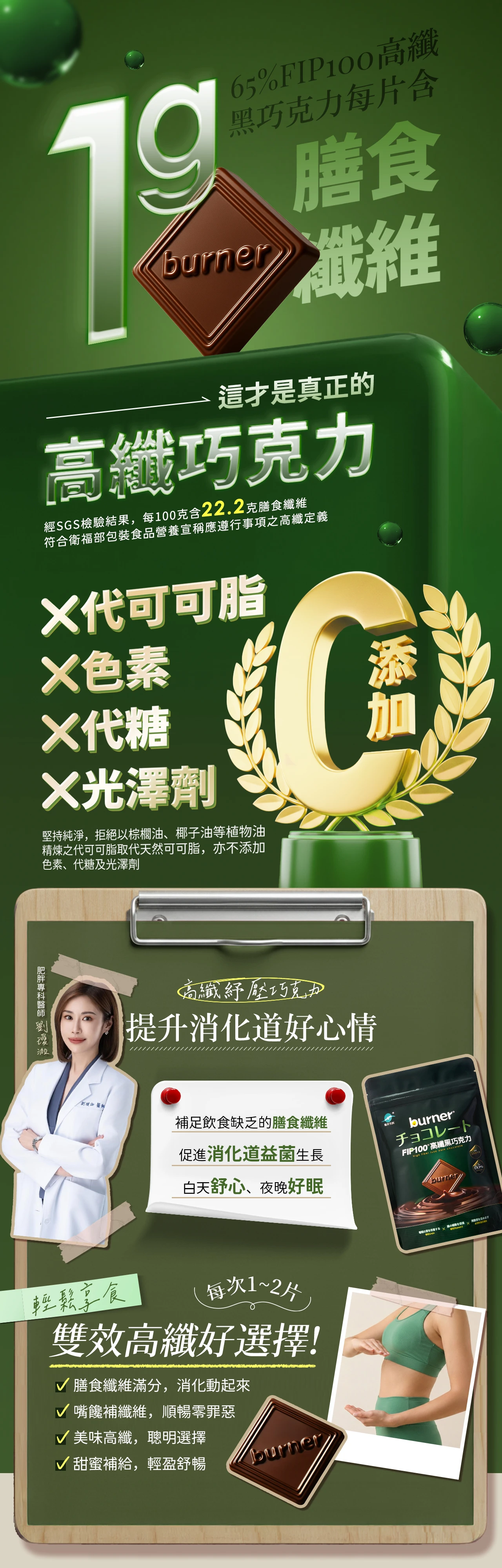 Q.經常外食、排便不順的人,吃這款巧克力有幫助嗎?獨家添加FIP100纖維粉三效順暢配方,日本專利Fibersol-2難消化性麥芽糊精-促進消化道益菌生長、Inulin菊苣纖維-幫助排便順暢,及Peptone 牛奶胜肽-從根本調節消化機能。建議每次食用1~2片,告別不順暢,還你加倍輕盈感,適合蔬果攝取不足或有排便困擾的外食族喔!