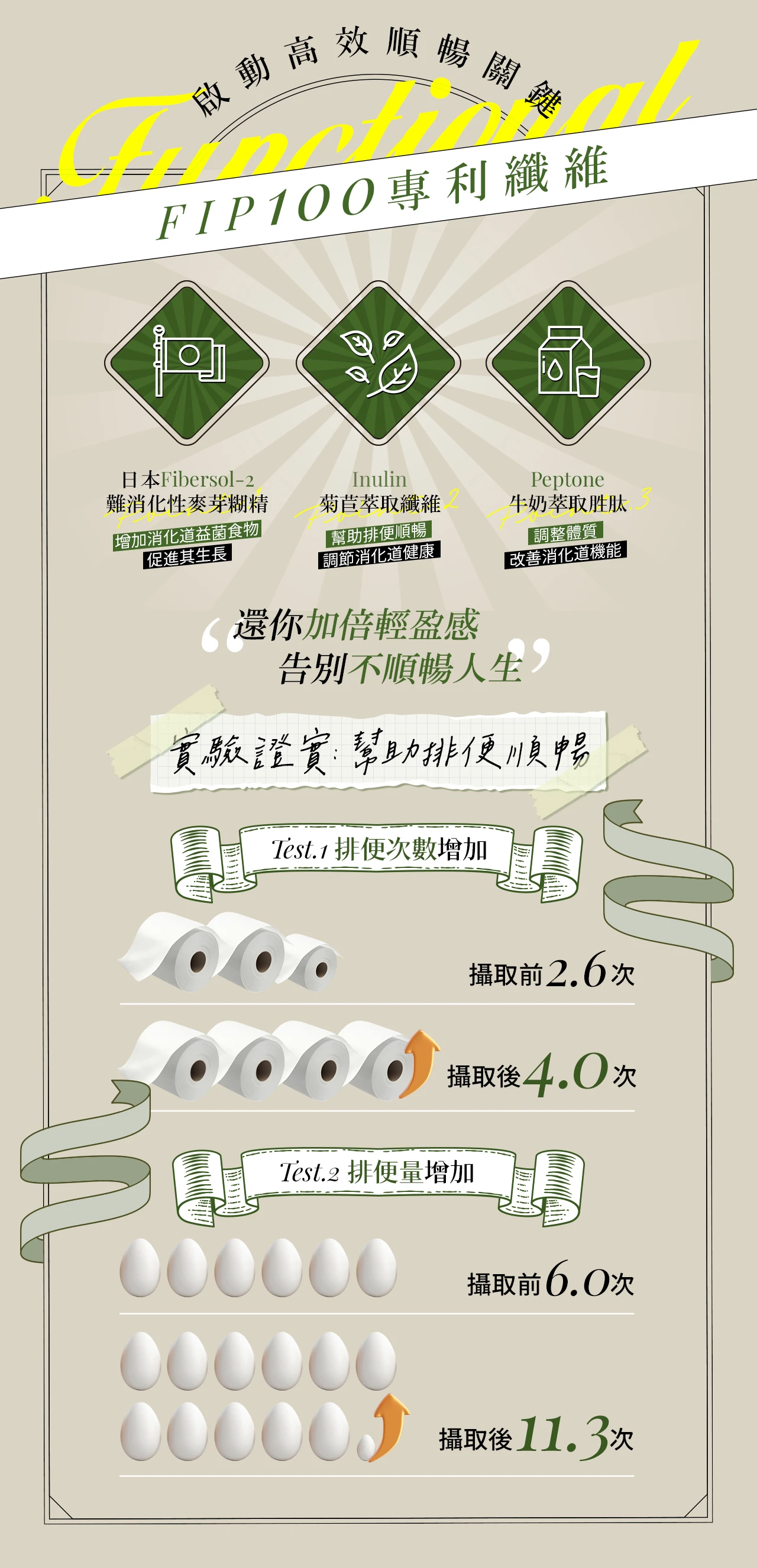 Q.「FIP100纖維」跟一般的益生菌有什麼不同?益生菌是「菌種」,而FIP100包含了專利Fibersol-2、菊苣纖維等成分,能直達消化道成為好菌的食物。簡單來說,不只補充纖維,更能幫您打造健康的腸道生態環境,讓排便更自然順暢,而不是靠刺激排泄。