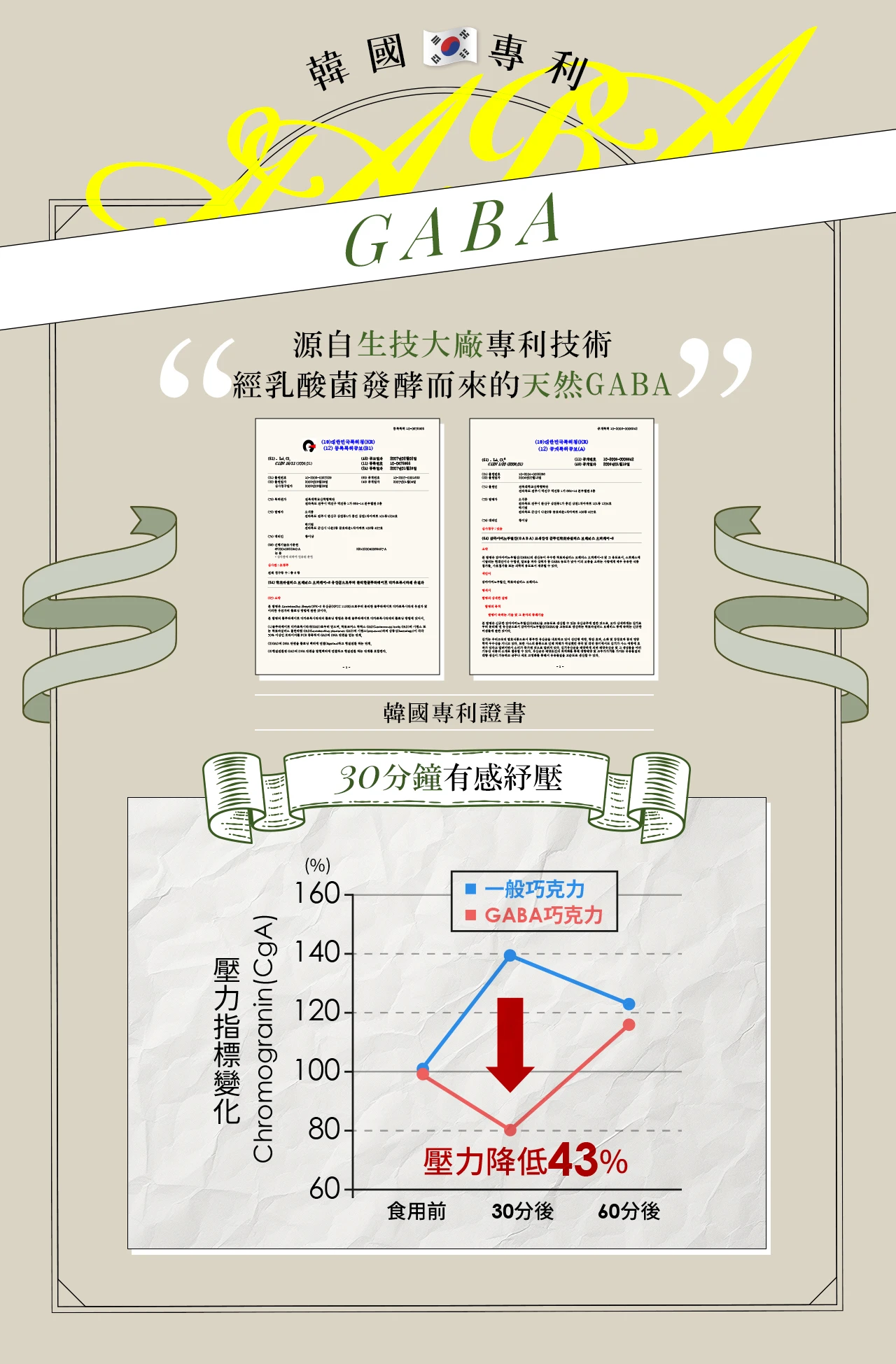 Q.裡面含有GABA,那晚上或「睡前」吃會不會因為咖啡因睡不著?請放心。雖然黑巧克力含有微量咖啡因,但我們特別添加了足量的天然GABA成分,經研究證實能幫助放鬆情緒、舒緩整日的緊繃感。許多愛用者分享,在晚餐後或睡前吃一片,是舒壓助眠的最佳床頭點心。