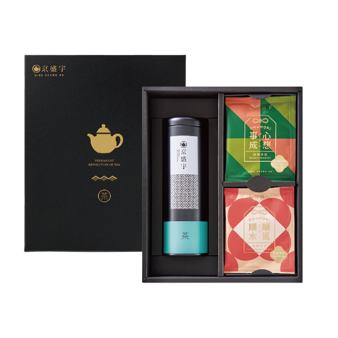 經典鐵罐茶葉加御守袋茶的特別組合,禮盒設計概念復刻金馬五十指定茶葉禮盒款式,凸顯質感,典雅大方。