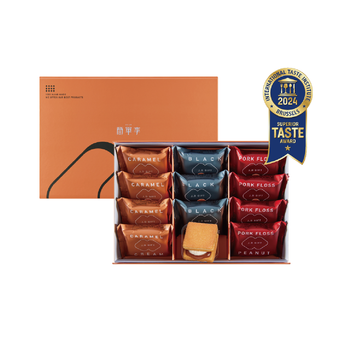 以暖色調為底、搭配書法墨色,表達年節喜氣意象,同時跳脫傳統,裡面滿載的不只是新創的夾心,還有濃厚心意與共享喜悅。