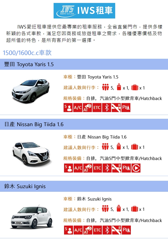 IWS租車-租車1500/1600c.c汽車租用一日券