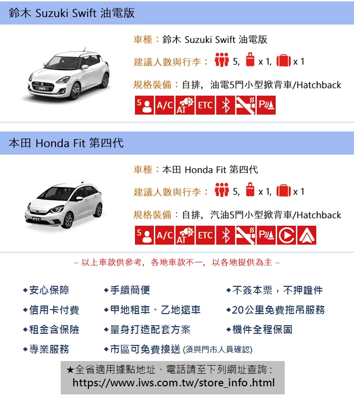 【通用券】IWS租車-租車1500/1600c.c汽車租用一
