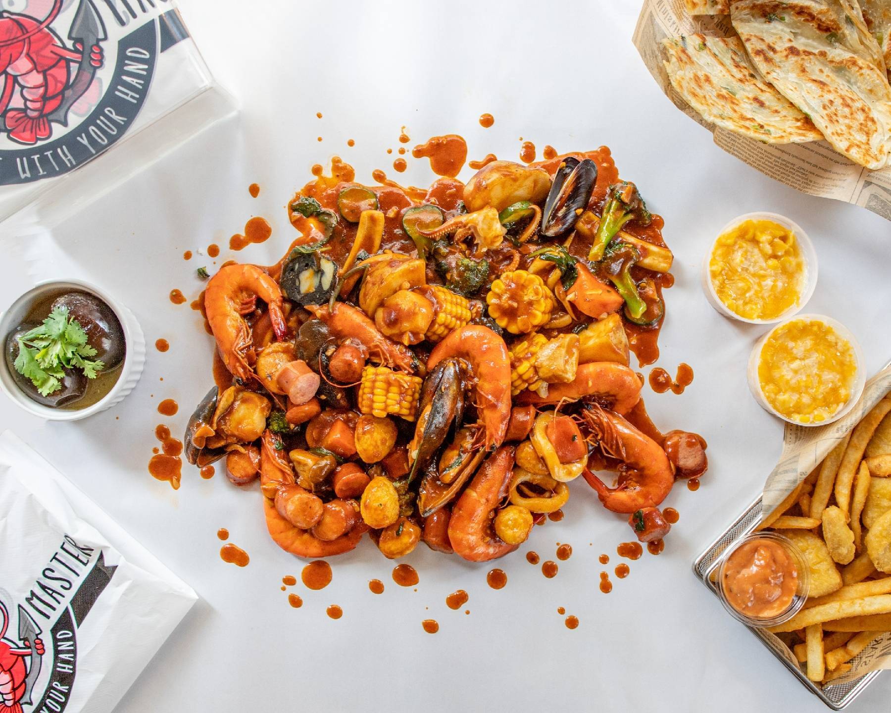 手抓海鮮起源自美國南方港口的海鮮新吃法,將煮熟海鮮放進袋中,以醬汁調味搖勻後倒在桌上,不使用餐具,而是直接用手抓著吃,豪邁的大啖海鮮。