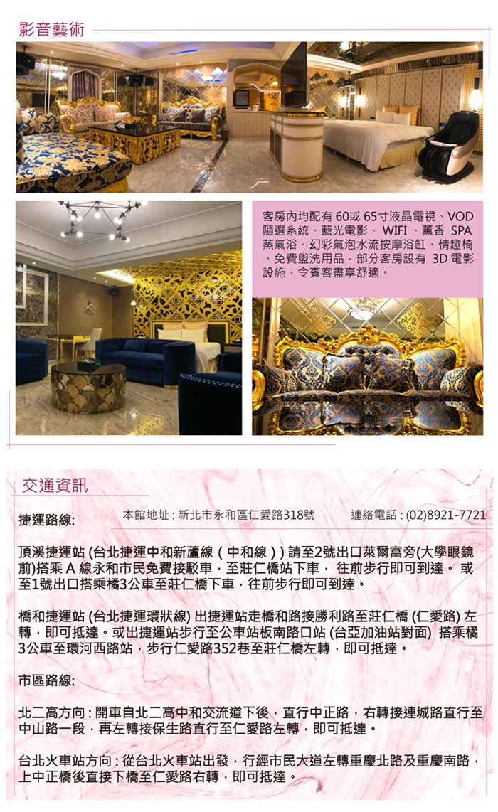 客房內均配有液晶電視、VOD隨選系統、藍光電影、WIFI、薰香 SPA 蒸氣浴、幻彩氣泡水流按摩浴缸、免費盥洗用品,部分客房設有 3D 影音、按摩椅、情趣椅設施,令賓客盡享舒適。
