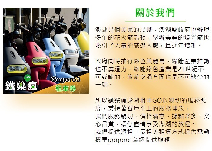 鐵樂瘋澎湖租車GO以親切的服務態度,秉持著客戶至上的服務理念, 我們服務親切、價格滿意、據點眾多、安心品質,讓您盡情享受澎湖的旅程。我們提供短租、長租等租賃方式提供電動機車gogoro 為您提供服務。