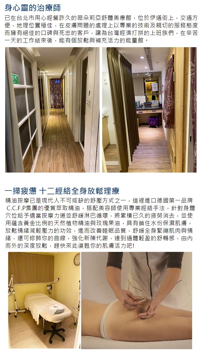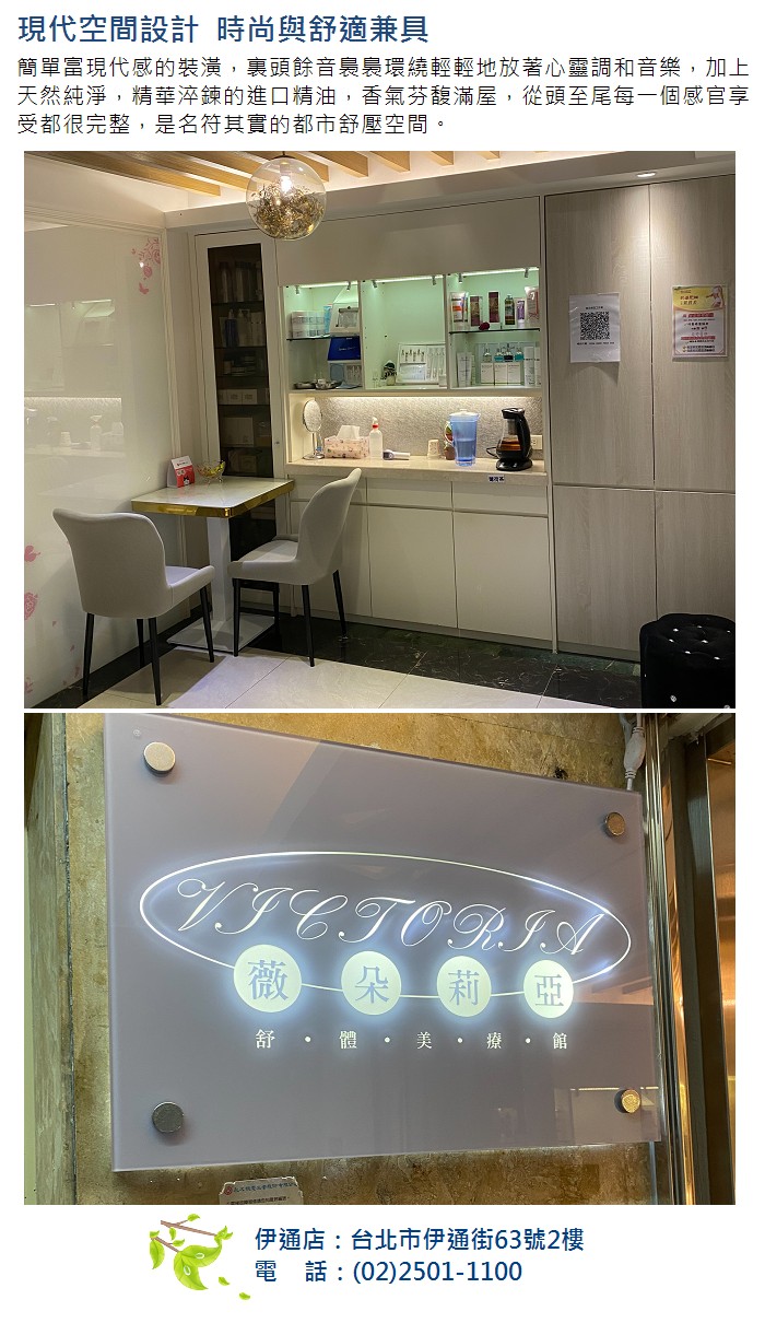 已在台北市用心經營許久的薇朵莉亞舒體美療館,分別位於大安路與伊通街精華地段上,不僅交通方便,地理位置極佳,在皮膚問題的處理上以專業的技術及親切的服務態度而擁有絕佳的口碑與死忠的客戶,讓為台灣經濟打拼的上班族們,在辛苦一天的工作結束後,能有個放鬆與補充活力的能量館。