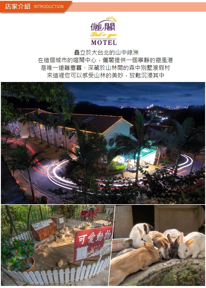 座落於中和圓通寺山下,佔地約5000坪,為台北地區獨特於萬坪綠蔭中,為忙碌都會人精心規劃的汽車旅館,進入儷閣讓您的身心靈,沐浴於森林芬多精及負離子中,真正感受到呼吸吐納之間的自在與舒暢,及空氣中散發著花香、草香的幸福氣息。
