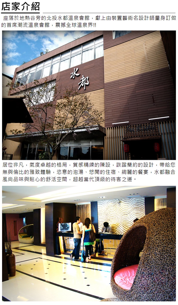居位非凡,氣度卓越的格局,質感精練的陳設,詼諧簡約的設計,帶給您無與倫比的雅致體驗,恣意的泡湯、悠閒的住宿、絢麗的餐宴,水都融合風尚品味與貼心的舒活空間,超越當代頂級的待客之道。