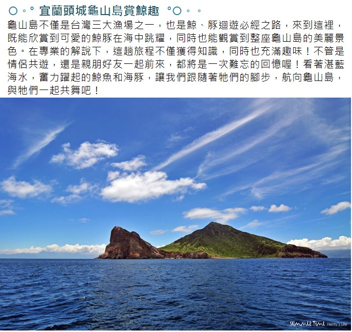 龜山島不僅是台灣三大漁場之一,也是鯨、豚迴遊必經之路,來到這裡,既能欣賞到可愛的鯨豚在海中跳耀,同時也能觀賞到整座龜山島的美麗景色。在專業的解說下,這趟旅程不僅獲得知識,同時也充滿趣味!不管是情侶共遊,還是親朋好友一起前來,都將是一次難忘的回憶喔!看著湛藍海水,奮力躍起的鯨魚和海豚,讓我們跟隨著牠們的腳步,航向龜山島,與牠們一起共舞吧!