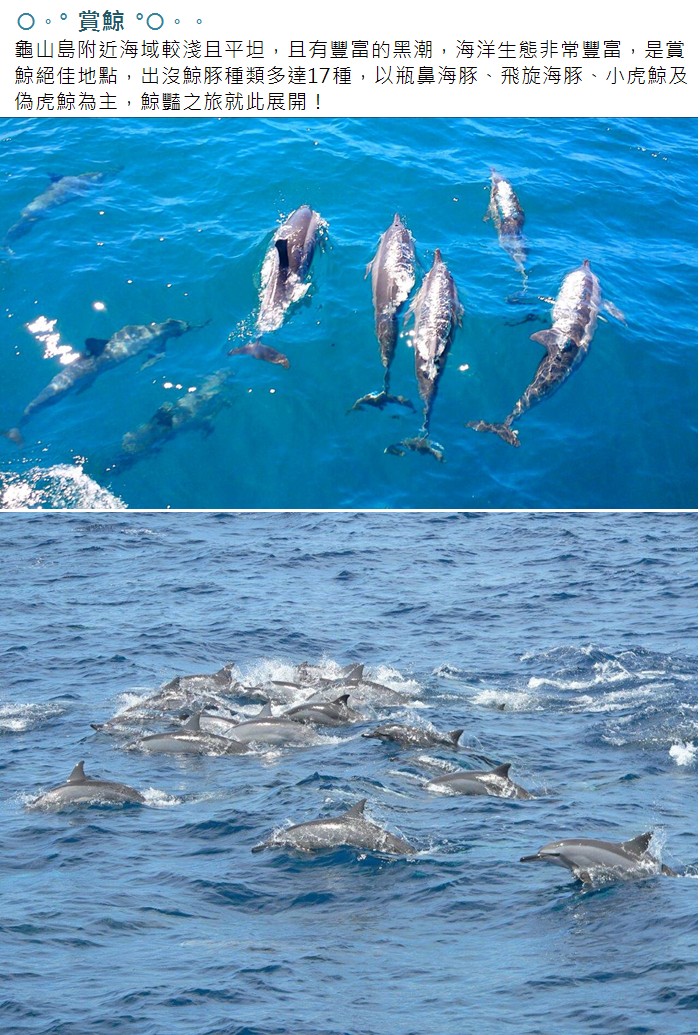 龜山島不僅是台灣三大漁場之一,也是鯨、豚迴遊必經之路,來到這裡,既能欣賞到可愛的鯨豚在海中跳耀,同時也能觀賞到整座龜山島的美麗景色。在專業的解說下,這趟旅程不僅獲得知識,同時也充滿趣味!不管是情侶共遊,還是親朋好友一起前來,都將是一次難忘的回憶喔!看著湛藍海水,奮力躍起的鯨魚和海豚,讓我們跟隨著牠們的腳步,航向龜山島,與牠們一起共舞吧!