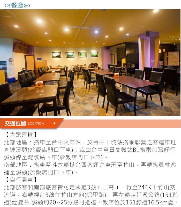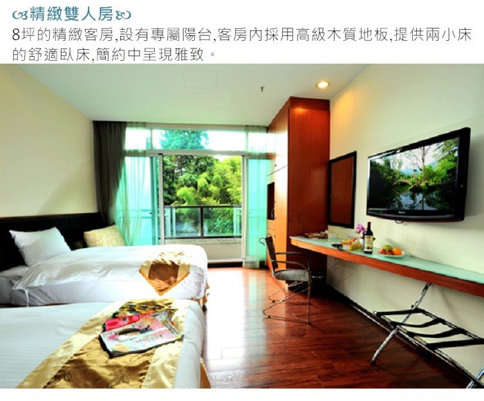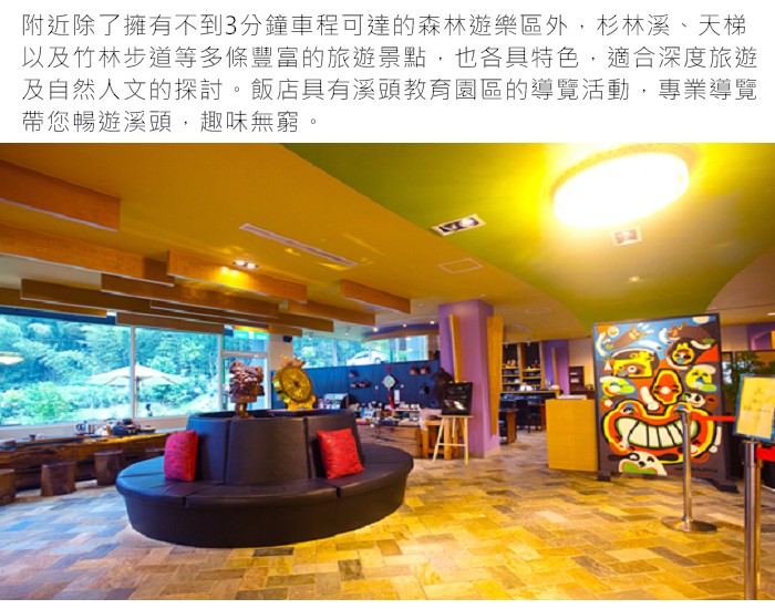 房間內設有景觀陽台,窗外望去,幅幅成畫, 引人入勝。附近除了擁有不到3分鐘車程可達的森林遊樂區外,杉林溪、 天梯以及竹林步道等多條豐富的旅遊景點,也各具特色,適合深度旅遊及自然人文的探討。