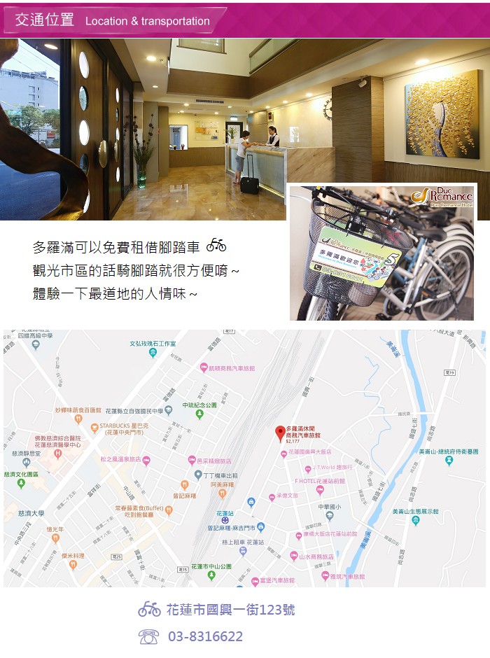 「多羅滿休閒商務汽車旅館」位於花蓮火車站前站出口左邊,沿客運站左轉國興一街,步行約5分鐘即可抵達。